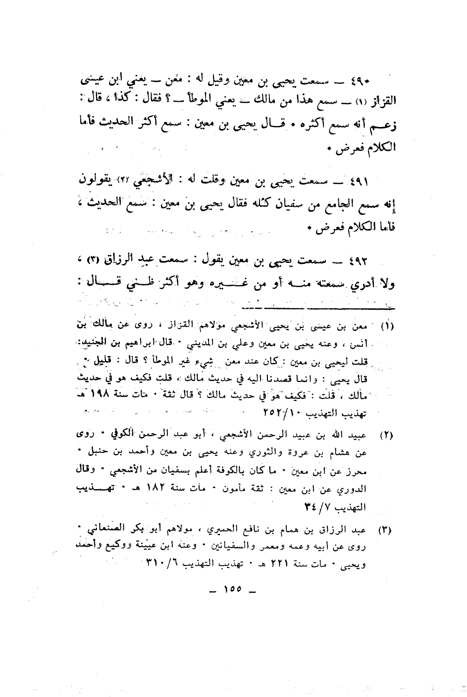 سمعت يحيى بن معين وقيل له معن يعنى ابن عيسى القزاز سمع هذا من مالك يعنى الموطأ فقال كذا قال زعم انه سمع اكثره قال يحيى بن معين سمع أكثر الحديث فأما الكلام فعرض سمعت يحيى بن معين وقلت له الاشجعى يقولون انه سمع الجامع من سفيان كله فقال يحيى بن معين سمع الحديث فأما الكلام فعرض سمعت يحيى بن معين يقول سمعت عبد الرزاق ولا ادرى سمعته منه او من غيره وهو اكثر ظنى قال