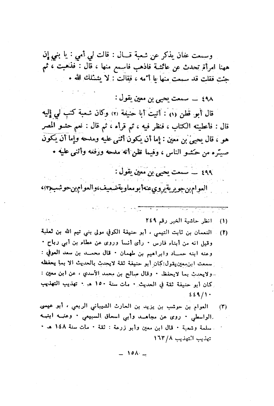 سمعت عفان يذكر عن شعبة قال قالت لى امى يابنى انه هنا امرأة تحدث عن عائشة فاذهب فاسمع منه قال فذهبت ثم فذهبت ثم جئت فقلت قد سمعت منها يا امة فقالت لا يشلك الله سمعت يحيى بن معين يقول قال ابو قطن اتيت ابا حنيفة وكان شعبة كتب لى اليه قال فأعطيته الكتاب فنظر فيه ثم قرأه ثم قال نعم حشو المصر هو قال يحيى بن معين اما ان يكون اثنى عليه ومدحه واما ان يكون صيره من حشو الناس وفيما ظن انه مدحه ورفعه واثنى عليه سمعت يحيى بن معين يقول العوام بن جويرية يروى عنه ابو معاوية ضعيف والعوام بن حوشب