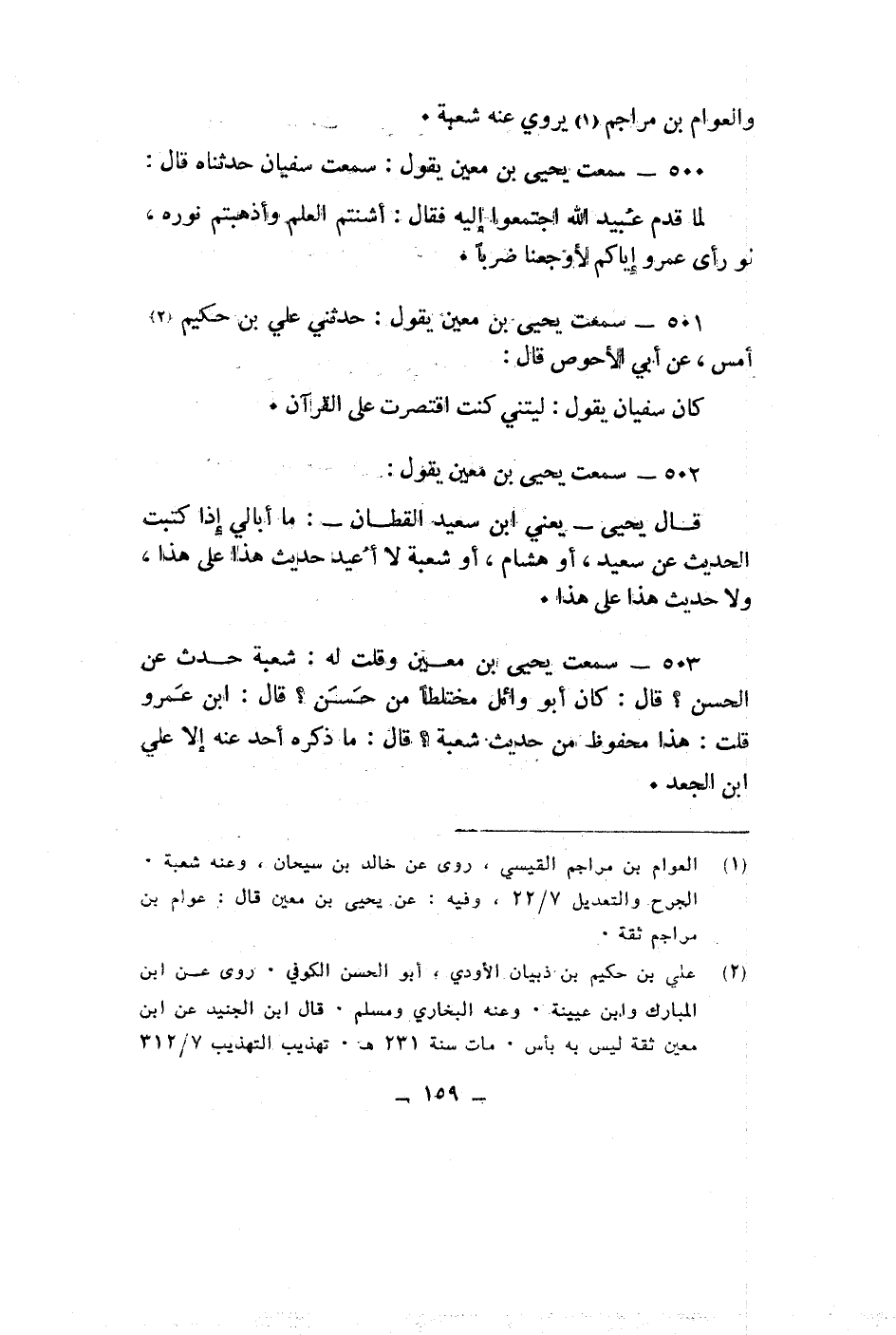 والعوام بن مراجم يروى عنه شعبة سمعت يحيى بن معين يقول سمعت سفيان حدثناه قال لما قدم عبيد الله اجتمعوا اليه فقال اشتنم العلم واذهبتم نوره لو راى عمرو واياكم لأوجعنا ضربا سمعت يحيى بن معين يقول حدثنى على بن حكيم امس عن ابى الأحوص قال كان سفيان يقول ليتنى كنت اقتصرت على القرآن سمعت يحيى بن معين يقول قال يحيى يعنى ابن سعيد القطان ما ابالى اذا كنت الحديث عن سعيد او هشام او شعبة لا اعيد حديث هذا على هذا ولا حديث هذا على هذا سمعت يحيى بن معين وقلت له شعبة حدث عن الحسن قال كان ابو وائل مختلطا من حسن قال ابن عمرو قلت هذا محفوظ من حديث شعبة قال ما ذكره احد عنه الا على ابن الجعد
