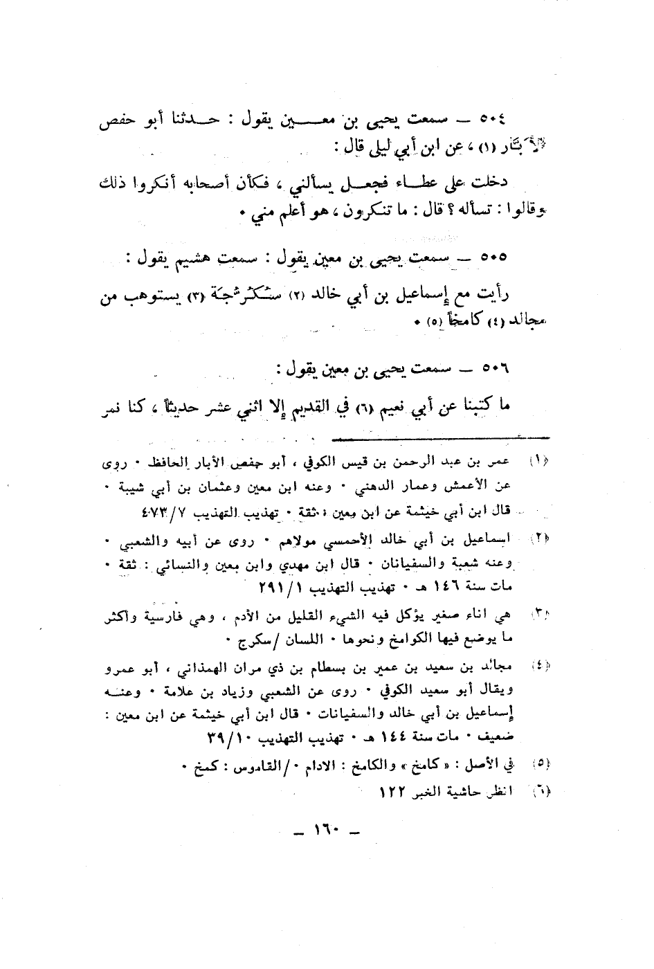 سمعت يحيى بن معين يقول حدثنا ابو حفص الأبار عن ابن ابى ليلى قال دخلت على عطاء فجعل يسألنى فكان اصحابه انكروا ذلك وقالوا تسأله قال ما تنكرون هو اعلم منى سمعت يحيى بن معين يقول سمعت هشيم يقول رأيت مع اسماعيل بن ابى خالد سكرجة يستوهب من مجالد كامخا سمعت يحيى بن معين يقول ما كتبنا عن ابى نعيم فى القديم الا اثنى عشر حديثا كنا نمر