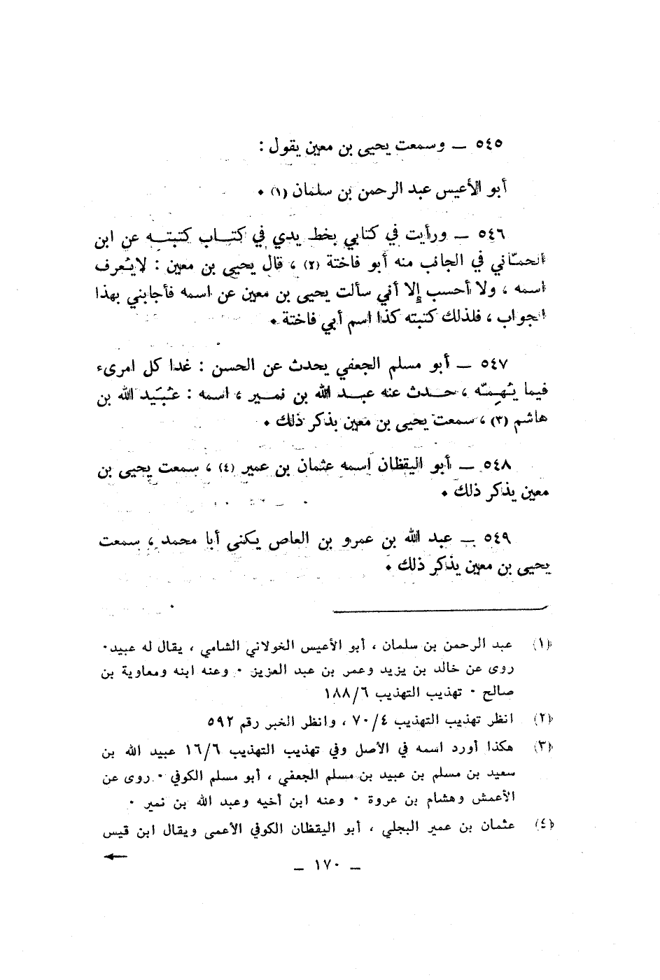 وسمعت يحيى بن معين يقول ابو الأعيس عبد الرحمن بن سليمان ورأيت فى كتابى بخط يدى فى كتاب كتبته عن ابن الحمانى فى الجانب منه ابو فاختة قال يحيى بن معين لا يعرف اسمه ولا احسب الا انى سألت يحيى بن معين عن اسمه فأجابنى بهذا الجواب فلذلك كتبته كذا اسم ابى فاختة ابو مسلم الجعفى يحدث عن الحسن إذا كل امرىء فيما يهمه حدث عنه عبد الله بن نمير اسمه عبيد الله بن هاشم سمعت يحيى بن معين يذكر ذلك ابو اليقظان اسمه عثمان بن عمير سمعت يحيى بن معين يذكر ذلك عبد الله بن عمرو بن العاص يكنى ابا محمد سمعت يحيى بن معين يذكر ذلك