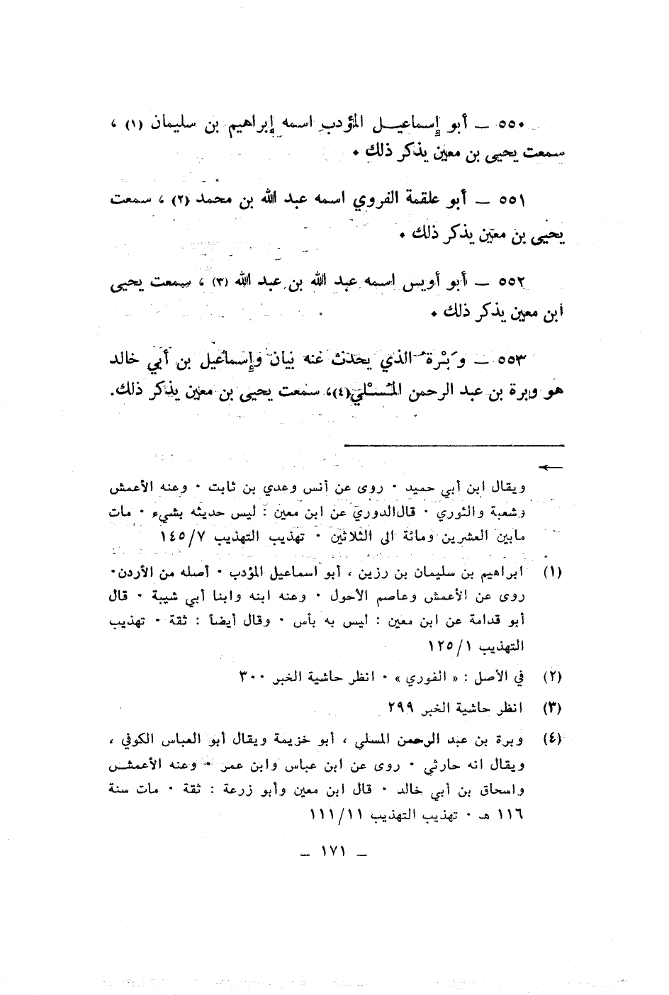 ابو اسماعيل المؤدب اسمه ابراهيم بن سليمان سمعت يحيى بن معين يذكر ذلك ابو علقمة الفروى اسمه عبد الله بن محمد سمعت يحيى بن معين يذكر ذلك ابو اويس اسمه عبد الله بن عبد الله سمعت يحيى بن معين يذكر ذلك وبسره الذى يحدث عنه بيان واسماعيل بن ابى خالد هو وبرة بن عبد الرحمن المسلى سمعت يحيى بن معين يذكر ذلك