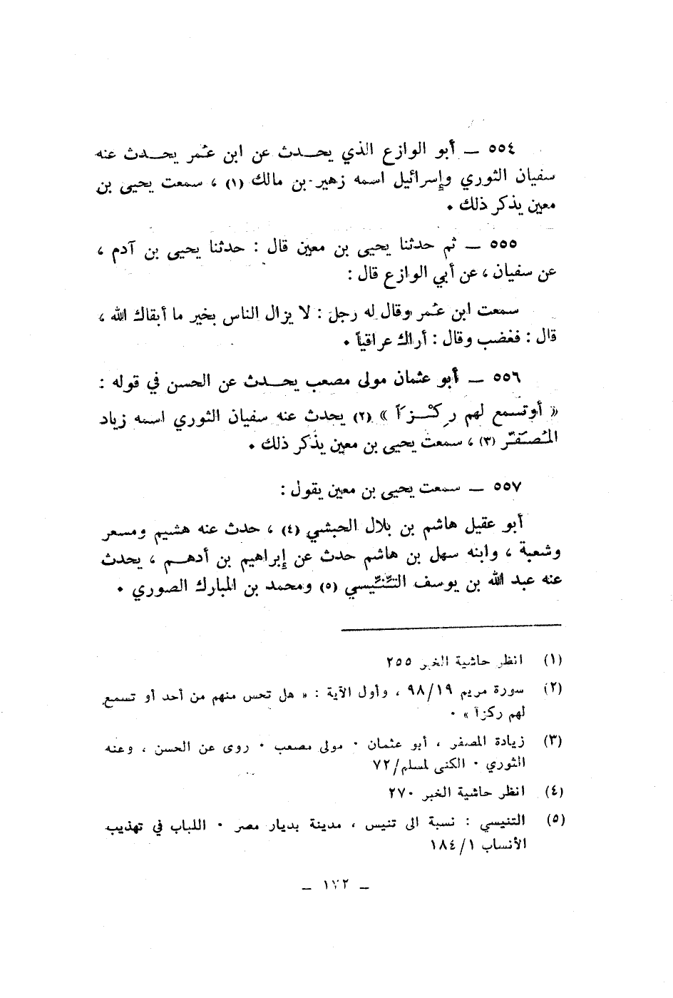 ابو الوزاع الذى يحدث عن ابى عمر يحدث عنه سفيان الثورى واسرائيل اسمه زهير بن مالك سمعت يحيى بن معين يذكر ذلك ثم حدثنا يحيى بن معين قال حدثنا يحيى بن آدم عن سفيان عن ابى الوزاع قال سمعت ابن عمر وقال له رجل لا يزال الناس بخير ما ابقاك الله قال فغضب وقال اراك عراقيا ابو عثمان مولى مصعب يحدث عن الحسن فى قوله اوتسمع لهم ركزا يحدث عنه سفيان الثورى اسمه زياد الصفر سمعت يحيى بن معين يذكر ذلك سمعت يحيى بن معين يقول ابو عقيل هاشم من بلاد الحبشى حدث عنه هشيم ومسعر وشعبة وابنه سهل بن هاشم حدث عن ابراهيم بن ادهم يحدث عنه عبد الله بن يوسف التنيسى ومحمد بن المبارك الصورى