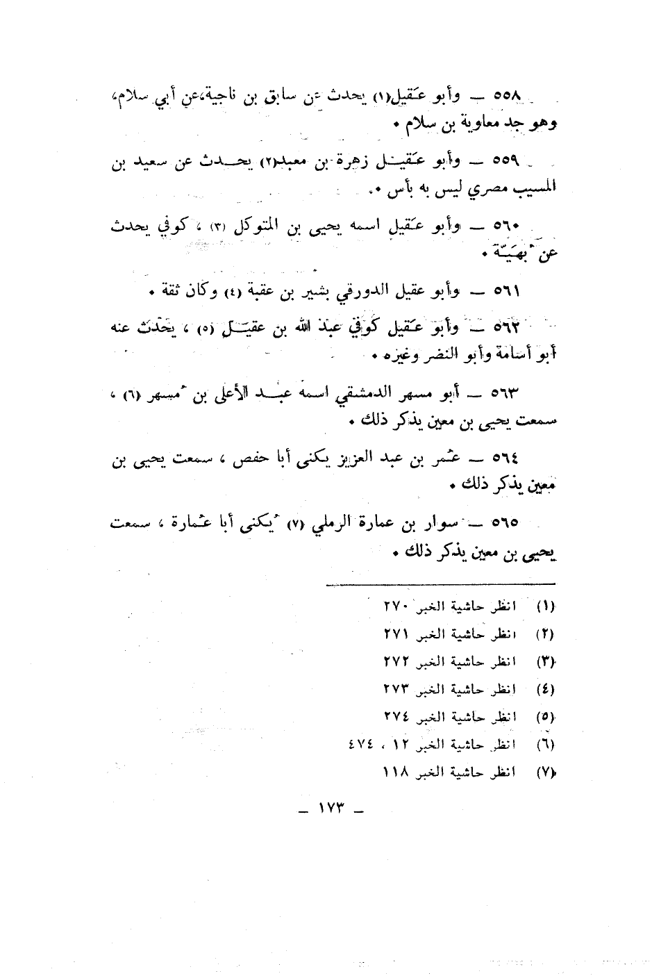 وابو عقيل يحدث عن سابق بن ناحية عن ابي سلام وهو جد معاوية بن سلام وابو عقيلازهرة بن معبد يحدث عن سعيد بن المسيب مصرى ليس بة باس وابو عقيل كوفى عبد اللة بن عقيل يحدث عن بهية وابو عقيل الدورقى بشير بن عقبة وكان ثقة وابو عقببل كوفى عبد اللة بن عقيل يحدث عنة ابو اسامة وابو النضر وغيرة ابو مسهر الدمشقى اسمة عبد الاعلى بن مسهر سمعت يحيى بن معين يذكر ذلك عمر بن عبد العزيز يكنى ابا حفص سمعت يحيى بن معين يذكر ذلك سوار بن عمارة الرملى يكنى ابا عمارة سمعت يحيى بن معين يذكر ذلك
