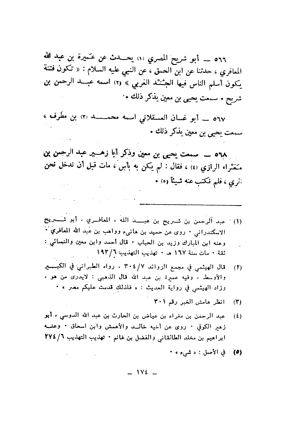 ابو شريح المصرى يحدث عن عميرة بن عبد الله المعافرى حدثنا عن ابن الحمق عن النبى عليه السلام تكون فتنة يكون اسلم الناس فيها الجند الغربى اسمه عبد الرحمن بن شريح سمعت يحيى بن معين يذكر ذلك ابو غسان العسقلانى اسمه محمد بن مطرف سمعت يحيى بن معين يذكر ذلك سمعت يحيى بن معين وذكر ابا زهير عبد الرحمن بن مغراء الرازى فقال لم يكن به بأس مات قبل ان ندخل نحن الرى فلم نكتب عنه شيئا