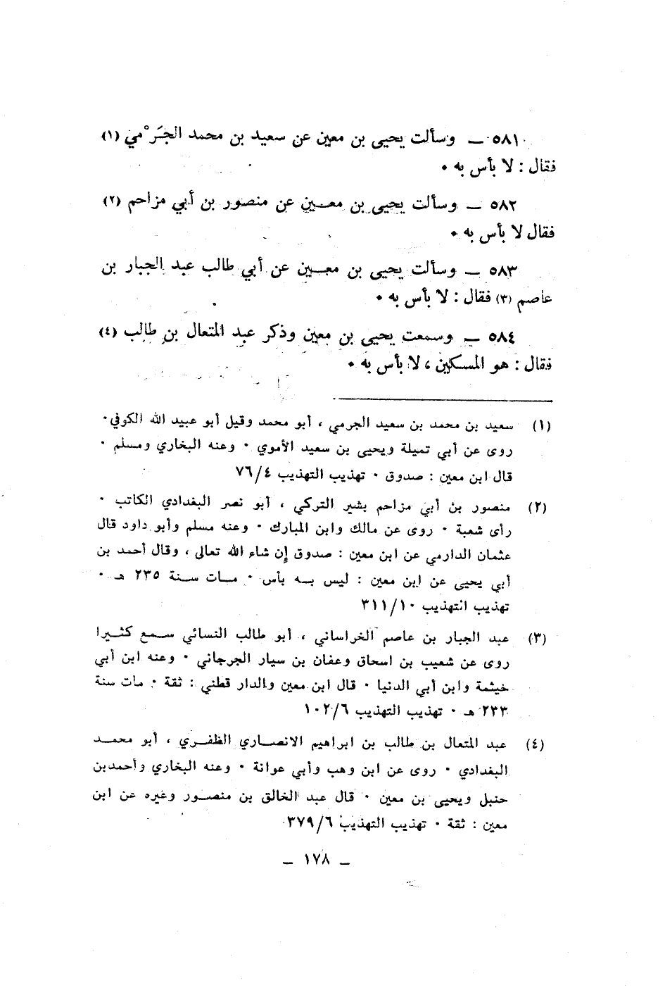 وسألت يحيى بن معين عن سعيد بن محمد الجرمى فقال لا بأس به وسألت يحيى بن معين عن منصور بن ابى مزاحم فقال لا بأس به وسألت يحيى بن معين عن ابى طالب عبد الجبار بن عاصم فقال لا بأس به وسمعت يحيى بن معين وذكر عبد المتعال بن طالب فقال هو المسكين لا بأس به