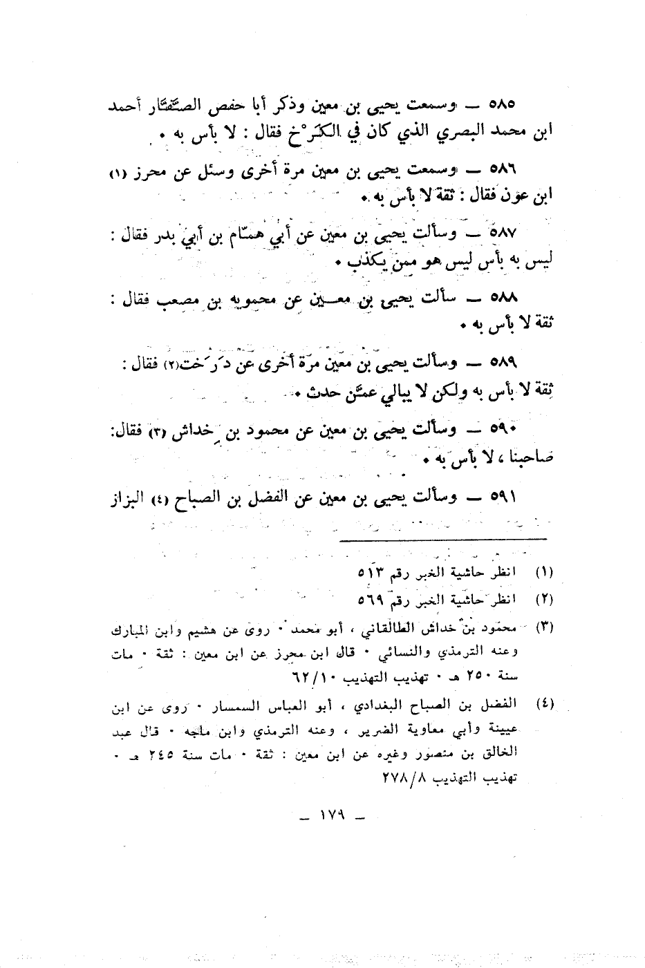 وسمعت يحيى بن معين وذكر ابا حفص الصفار احمد ابن محمد البصرى الذى كان فى الكرخ فقال لا بأس به وسمعت يحيى بن معين مرة اخرى وسئل عن محرز ابن عون فقال ثقة لا بأس به وسألت يحيى بن معين عن ابى همام بن ابى بدر فقال ليس به بأس هو ممن يكذب سألت يحيى بن معين عن محموية بن مصعب فقال ثقة لا بأس به وسالت يحيى بن معين مرة اخرى عن درخت فقال ثقة لا بأس به ولكنى لا يبالى عمن حدث وسألت يحيى بن معين عن محمود بن خداش فقال صاحبنا لا باس به وسألت يحيى بن معين عن الفضل بن الصباح البزاز
