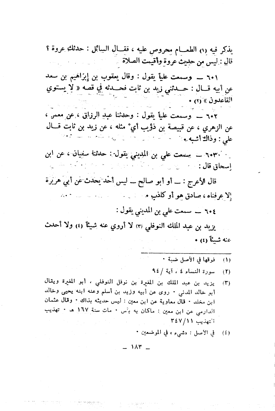 يذكر فيه الطعام محروص عليه فقال السائل حدثك عروة قال ليس من حديث عروة واقيمت الصلاة وسمعت عليا يقول وقال يعقوب بن ابراهيم بن سعد عن ابيه قال حدثنى زيد بن ثابت فحدثه فى قصة لا يستوى القاعدون وسمعت عليا يقول وحدثنا عبد الرزاق عن معمر عن الزهرى عن قبيصة بن ذؤيب اى مثله عن يزيد بن ثابت قال على وذاك أشبه سمعت على بن المدينى يقول حدثنا سفيان عن ابن اسحاق قال قال الأعرج او ابو صالح ليس احد يحدث عن ابى هريرة الا عرفناه صادق هو او كاذب سمعت على بن المدينى يقول يزيد بن عبد الملك النوفلى لا اروى عنه شيئا ولا احدث عنه شيئا