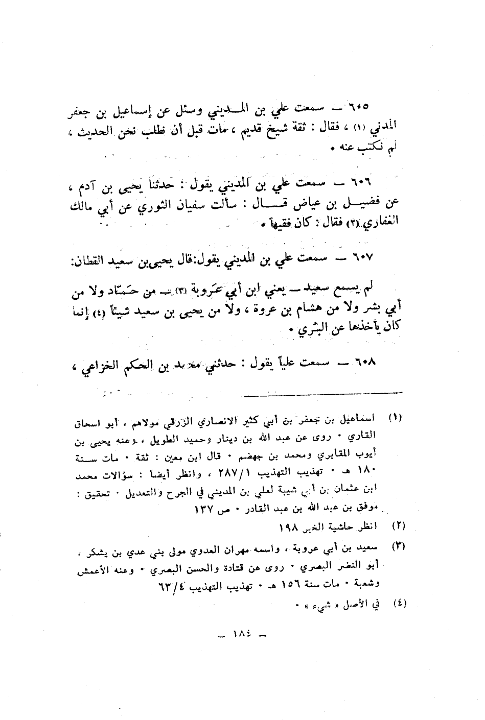 سمعت على بن المدينى وسئل عن اسماعيل بن جعفر المدنى فقال ثقة شيخ قديم مات قبل ان نطلب نحن الحديث لم نكتب عنه سمعت على بن المدينى يقول حدثنا يحيى بن ادم عن فضيل بن عياض قال سألت سفيان الثورى عن ابى مالك الغفارى فقال كان فقيها سمعت على بن المدينى يقول قال يحيى بن سعيد القطان لم يسمع سعيد يعنى ابن ابى عروبة من حماد ولا من ابى بشر ولا من هشام بن عروة ولا من يحيى بن سعيد شيئا انما كان يأخذها عن البرى سمعت عليا يقول حدثنى محمد بن الحكم الخزاعى