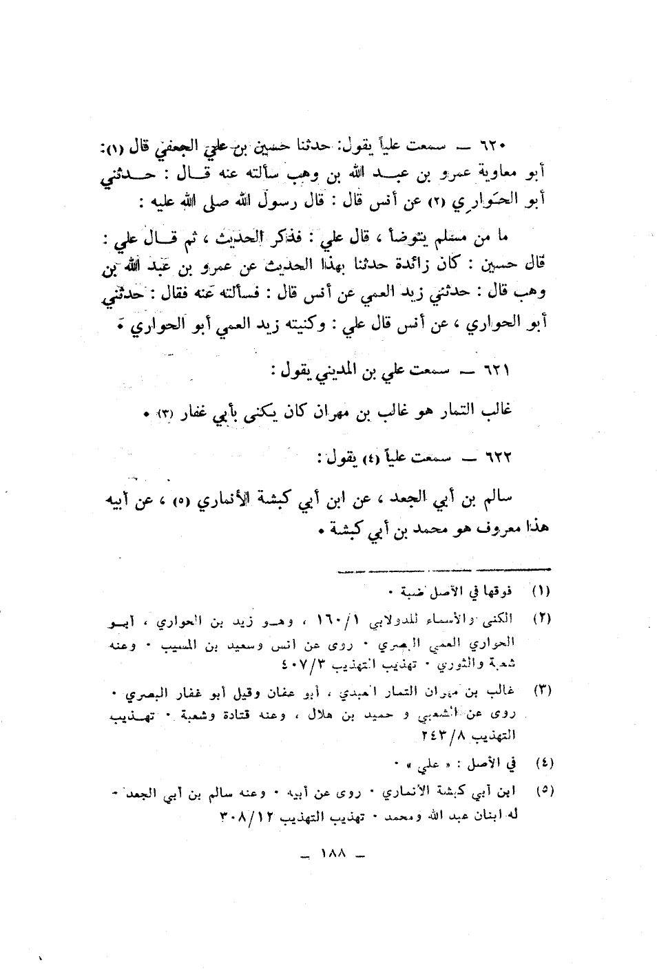 عن أنس قال علي وكنيته زيد العمي أبو الحواري سمعت علي بن المديني يقول غالب التمار هو غالب بن مهران كان يكنى بأبي غفار سمعت عليا يقول سالم بن أبي الجعد عن ابن أبي كبشة الأنماري عن أبيه هذا معروف هو محمد بن أبي كبشة