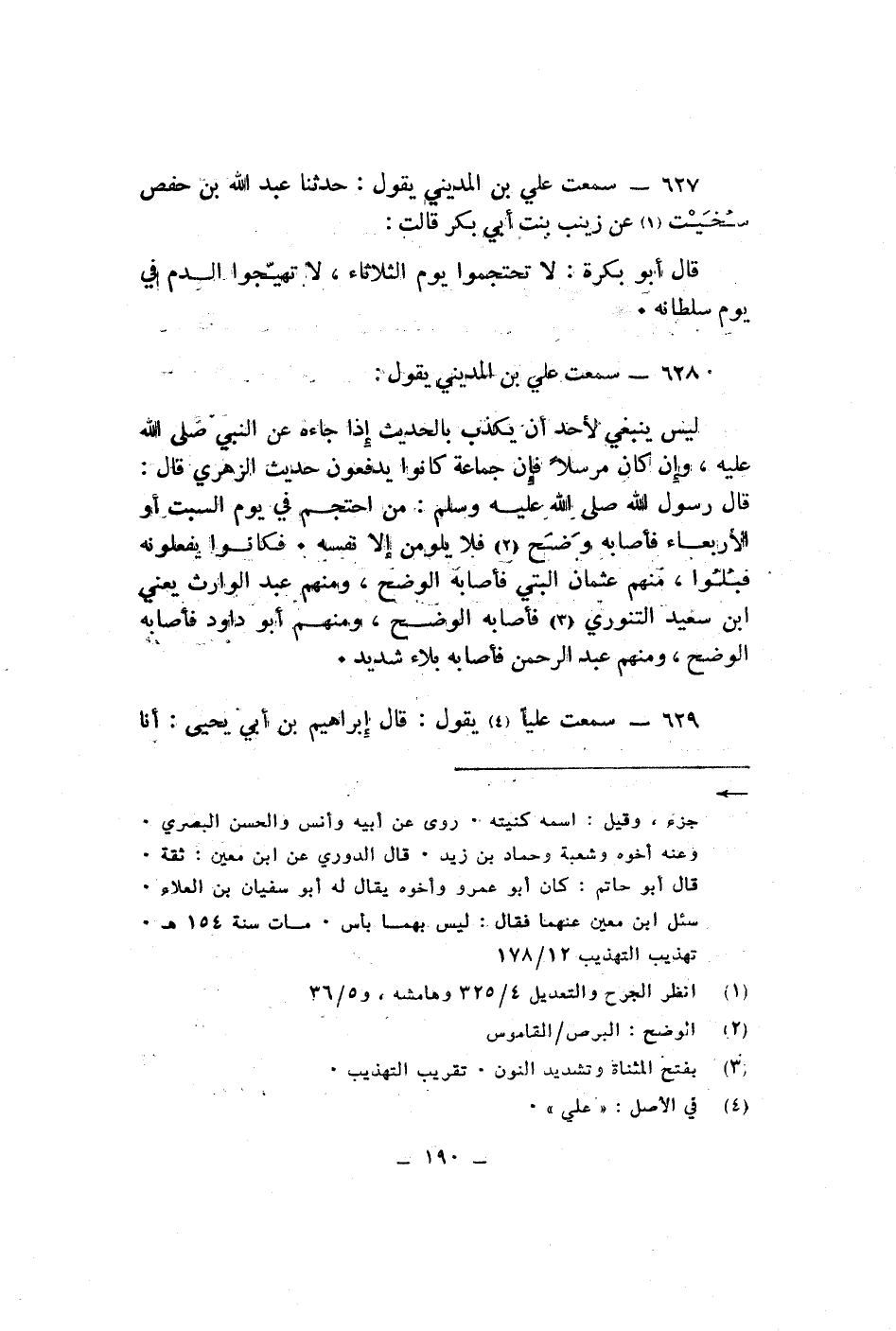 سمعت على بن المدينى يقول حدثنا عبد الله بن خفص سخيت عن زينب بنت ابى بكر قال قال ابو بكرة لا تحتجموا يوم الثلاثاء لا تهيجوا الدم فى يوم سلطانه سمعت على بن المدينى يقول ليس ينبغى لأحد ان يكذب بالحديث اذا جاءه عن النبى صلى الله عليه وان كان مرسلا فإن جماعة كانوا يدفعون حديث الزهرى قال قال رسول الله صلى الله عليه وسلم من احتجم فى يوم السبت او الأربعاء فأصابه وضح فلا يلومن الا نفسه فكانوا يفعلونه فبلوا منهم عثمان البتى فأصابه الوضح ومنهم عبد الوارث يعنى ابن سعيد التنورى فأصابه الوضح ومنهم ابو داود فأصابه الوضح ومنهم عبد الرحمن فأصابه بلاء شديد سمعت عليا يقول قال ابراهيم بن ابى يحيى انا