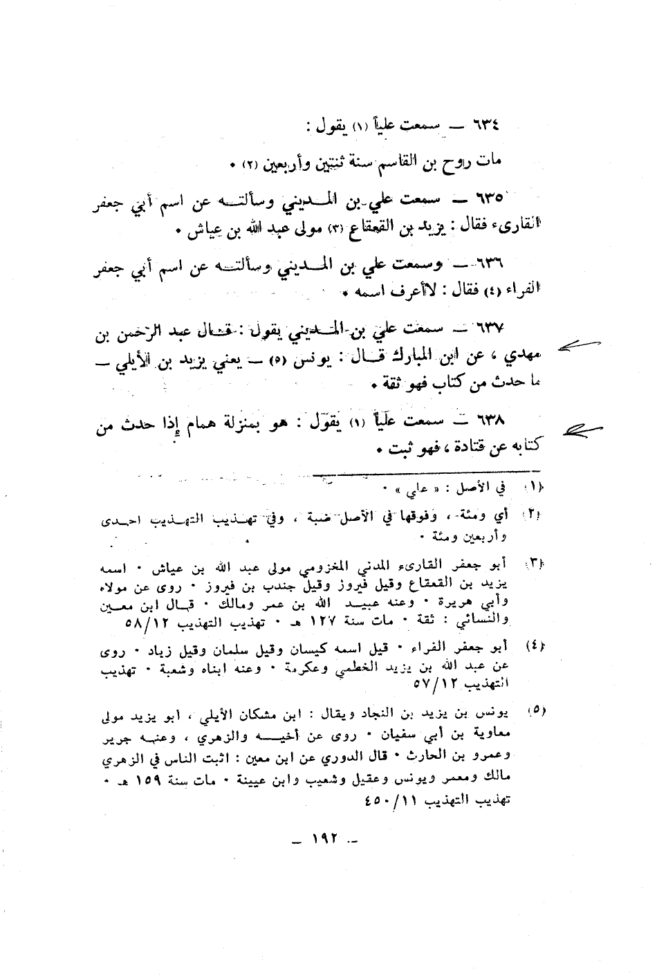 سمعت عليا يقول مات روح بن القاسم سنة ثنتين واربعين سمعت على بن المدينى وسألته عن اسم ابى جعفر القارىء فقال يزيد بن القعقاع مولى عبد الله بن عياش وسمعت على بن المدينى وسألته عن اسم ابى جعفر الفراء فقال لا أعرف اسمه سمعت على بن المدينى يقول قال عبد الرحمن بن مهدى عن ابن المبارك قال يونس يعنى يزيد بن الأيلى ما حدث من كتاب فهو ثقة سمعت عليا يقول هو منزله همام اذا حدث من كتابه عن قتادة فهو ثبت