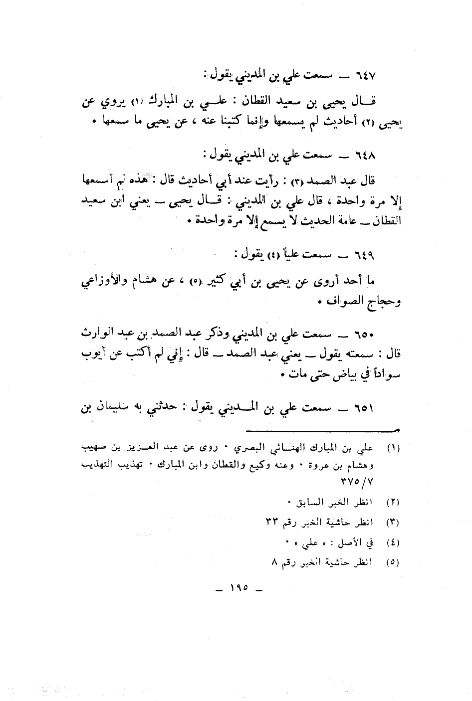 سمعت على بن المدينى يقول قال يحيى بن سعيد القطان على بن المبارك يروى عن يحيى احاديث لم يسمعها وانما كتبنا عنه عن يحيى ما سمعها سمعت على بن المدينى يقول قال عبد الصمد رأيت عند ابى احاديث قال هذه لم اسمعها الا مرة واحدة قال على بن المدينى قال يحيى يعنى ابن سعيد القطان عامة الحديث لا يسمع الا مرة واحدة سمعت عليا يقول ما احد اروى عن يحيى بن ابى كثير عن هشام والاوزاعى وحجاج الصواف سمعت على بن المدينى وذكر عبد الصمد بن عبد الوارث قال سمعته يقول يعنى عبد الصمد قال انى لم اكتب عن ايوب سوادا فى بياض حتى مات سمعت على بن المدينى يقول حدثنى به سليمان بن