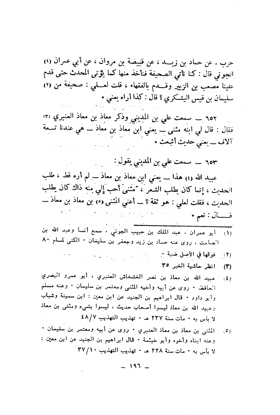 حرب حماد بن زيد عن قبيصة بن مروان عن ابى عمران الجونى قال كنا نأتى الصحيفة فنأخذ منها كما يؤتى المحدث حتى قدم علينا مصعب بن الزبير وقدم بالفقهاء قلت لعلى صحيفة من سليمان بن قيس اليشكرى قال كذا اراه يعنى سمعت على بن المدينى وذكر معاذ بن معاذ العنبرى فقال قال لى ابنة مثنى يعنى ابن معاذ بن معاذ هى عندنا تسعة آلاف يعنى حديث أشعت سمعت على بن المدينى يقول عبيد الله هذا يعنى ابن معاذ بن معاذ لم اراه قط طلب الحديث انما كان يطلب الشعر مثنى احب الى منه ذاك كان يطلب الحديث فقلت لعلى هو ثقة اعنى المثنى بن معاذ بن معاذ قال نعم