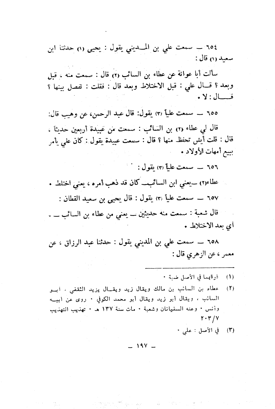 سمعت على بن المدينى يقول يحيى حدثنا ابن سعيد قال سألت ابا عوانة عن عطاء بن السائب قال سمعت منه قبل وبعد قال على قبل الاختلاط وبعد قال فقلت تفصل بينها قال لا سمعت عليا يقول قال عبد الرحمن عن وهيب قال قال لى عطاء بن السائب سمعت من عبيدة اربعين حديثا قال قلت ايش تحفظ منها قال سمعت عبيدة يقول كان على يأمر بييع امهات الأولاد سمعت عليا يقول عطاء يعنى ابن السائب كان قد ذهب امره يعنى اختلط سمهت عليا يقول قال يحيى بن سعيد القطان قال شعبة سمعت منه حديثين يعنى من عطاء بن السائب اى بعد الاختلاط سمعت على بن المدينى يقول حدثنا عبد الرازق عن معمر عن الزهرى قال