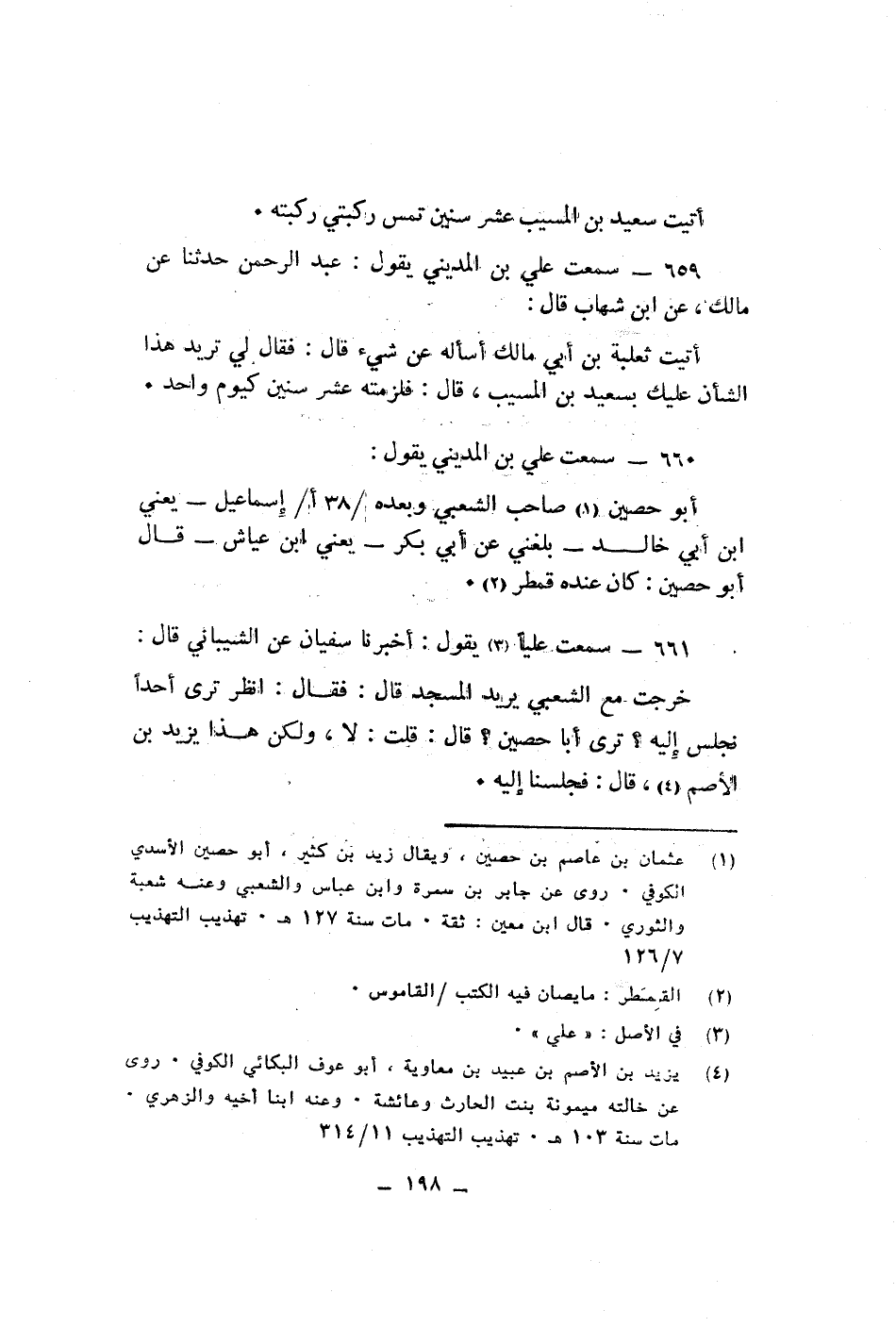 أتيت سعيد بن المسيب عشر سنين تمس ركبتى ركبته سمعت على بن المدينى يقول عبد الرحمن حدثنا عن مالك عن ابن شهاب قال اتيت ثعلبة بن ابى مالك اسأله عن شىء قال فقال لى تريد هذا الشأن عليك بسعيد بن المسيب قال فلزمته عشر سنين كيوم واحد سمعت على بن المدينى يقول ابو حصين صاحب الشعبى وبعده اسماعيل يعنى ابن ابى خالد بلغنى عن ابى بكر يعنى عن ابن عياش قال ابو الحصين كان عنده قمطر سمعت عليا يقول اخبرنا سفيان عن الشيبانى قال خرجت مع الشعبى يريد المسجد قال فقال انظر ترى احدا نجلس اليه ترى ابا حصين قال قلت لا ولكن هذا يزيد بن الأصم قال فجلسنا اليه