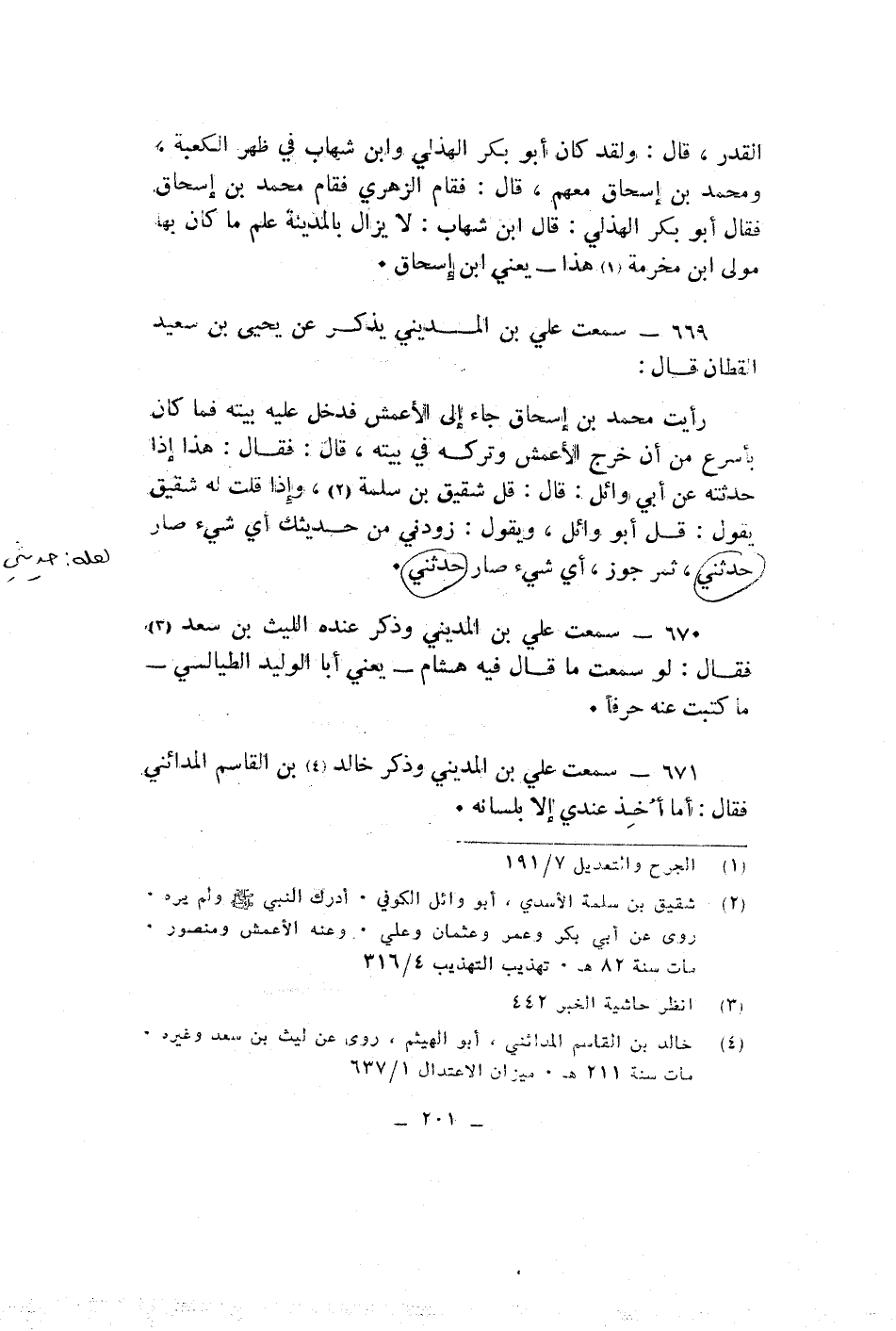 القدر قال ولقد كان ابو بكر الهدلى وابن شهاب فى ظهر الكعبة ومحمد بن اسحاق معهم قال فقام الزهرى فقام محمد بن اسحاق فقال ابو بكر الهدلى قال ابن شهاب لا يزال بالمدينة علم ما كان بها مولى ابن مخرمة هذا يعنى ابن اسحاق سمعت على بن المدينى يذكر عن يحيى بن سعيد القطان قال رأيت محمد بن اسحاق جاء الى الأعمش فدخل عليه بيته فما كان بأسرع من ان خرج الأعمش وتركه فى بيته قال فقال هذا اذا حدثته عن ابى وائل قال قل شقيق بن سلمة واذا قلت له شقيق يقول قل ابو وائل ويقول زودنى من حديثك اى شىء صار حدثنى ثمر جوز اى شىء صار حدثنى سمعت على بن المدينى وذكر عنده الليث بن سعد فقال لو سمعت ما قال فيه هشام يعنى ابا الوليد الطيالسى ما كتبت عنه حرفا سمعت على بن المدينى وذكر خالد بن القاسم المدائنى فقال اما اخذ عندى الا بلسانه