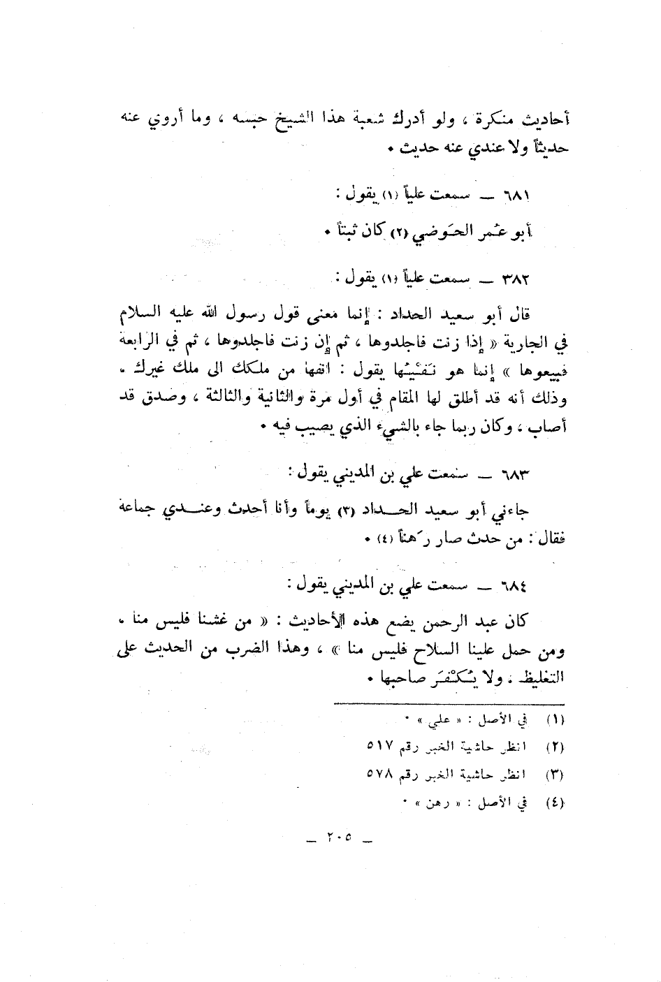 أحاديث منكرة ولو ادرك شعبة هذا الشيخ حبسه وما اروى عنه حديثا ولا عندى عنه حديث سمعت عليا يقول ابو عمر الحوضى كان ثبتا سمعت عليا يقول قال ابو سعيد الحداد انما معنى قةل رسول الله عليه السلام فى الجارية اذا زنت فاجلدوها ثم ان زنت فاجلدوها ثم ان زنت فاجلدوها ثم فى الرابعة فيبعوها انما هو نفسها يقول انفها من ملكك الى ملك غيرك وذلك انه قد اطلق لها المقام فى اول مرة والثانية والثالثة وصدق قد أصاب وكان ربما جاء بالشيء الذى يصيب فيه سمعت على بن المدينى يقول جاءنى ابو سعيد الحداد يوما وانا احدث وعندى جماعة فقال من حدث صار هنا سمعت على بن المدينى يقول كان عبد الرحمن يضع هذه الأحاديث من غشنا فليس منا ومن حمل علينا السلاح فليس منا وهذا الضرب من الحديث على التغليظ ولا يكفر صاحبها