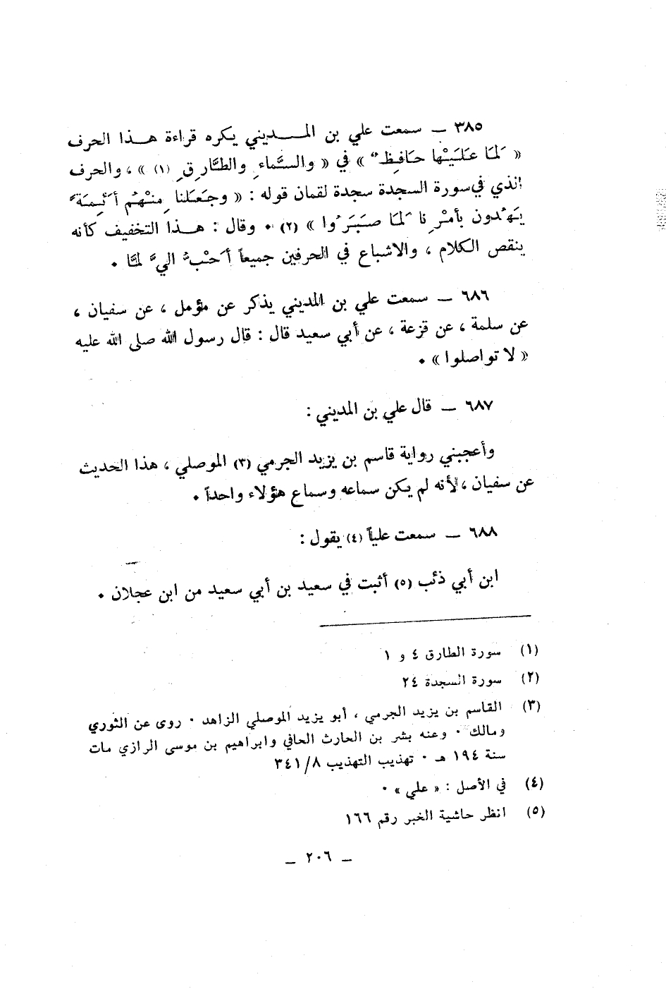 سمعت على بن المدينى يكره قراءة هذا الحرف لما عليها حافظ فى والسماء والطارق والحرف الذى فى سورة السجدة سجدة لقمان قوله وجعلنا منهم ائمة يهدون بأمرنا لما صبروا وقال هذا التخفيف كأنه ينقص الكلام والأشباع فى الحرفين جميعا احب الى لما سمعت على بن المدينى يذكر عن مؤمل عن سفيان عن سلمة عن قزعة عن ابى سعيد قال قال رسول الله صلى الله عليه لا تواصلوا قال على بن المدينى وأعجبنى رواية قاسم بن يزيد الجرمى الموصلى هذا الحديث عن سفيان لأنه لم يكن سماعة وسماع هؤلاء واحدا سمعت عليا يقول ابن ابى ذئب اثبت فى سعيد من ابن عجلان