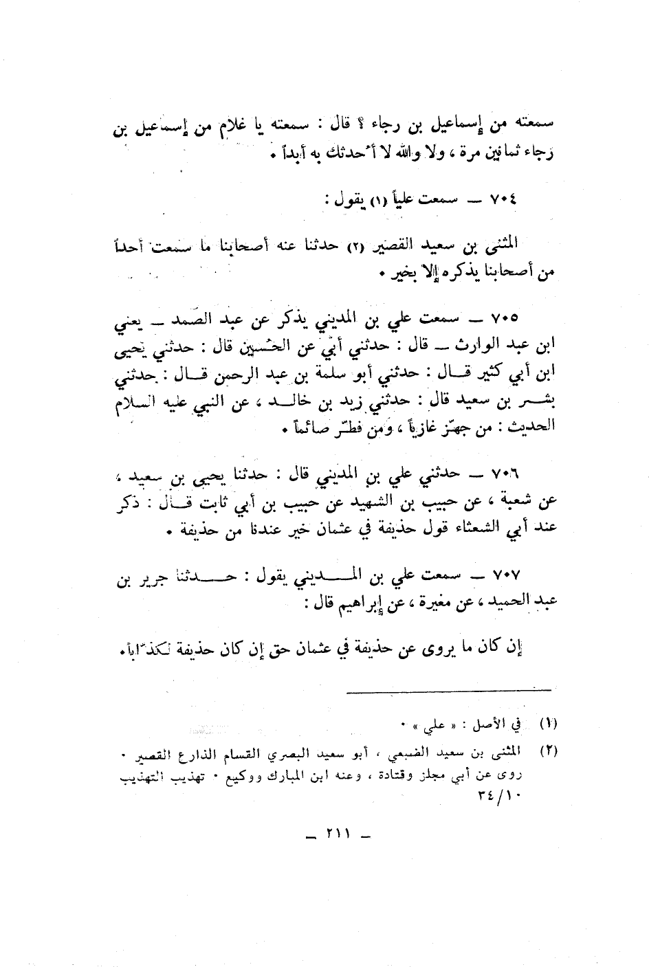 سمعته من اسماعيل بن رجاء قال سمعته يا غلام من اسماعيل بن رجاء ثمانين مرة ولا والله لا أحدثك ب هابدا سمعت عليا يقول المثنى بن سعيد القصير حدثنا عنه اصحابنا ما سمعت احدا من اصحابنا يذكره الا بخيرسمعت على بن المدينى يذكر عن عبد الصمد يعنى ابن عبد الوارث قال حدثنى ابى عن الحسين قال حدثنى يحيى ابن ابى كثير قال حدثنى ابو سلمة بن عبد الرحمن قال حدثنى بشر بن سعيد قال حدثنى زيد بن خالد عن النبى عليه السلام الحديث من جهز غازيا ومن فطر صائما حدثنى على بن المدينى قال حدثنا يحيى بن سعيد عن شعبة عن حبيب بن الشهيد عن حبيب بن ابى ثابت قال ذكر عند ابى الشعشاء قول حذيفة فى عثمان خير عندنا من حذيفة سمعت على بن المدينى يقول حدثنا جرير بن عبد الجميد عن مغيرة عن ابراهيم قال ان كان ما يروى عن حذيفة فى عثمان حق ان كان حذيفة لكذابا