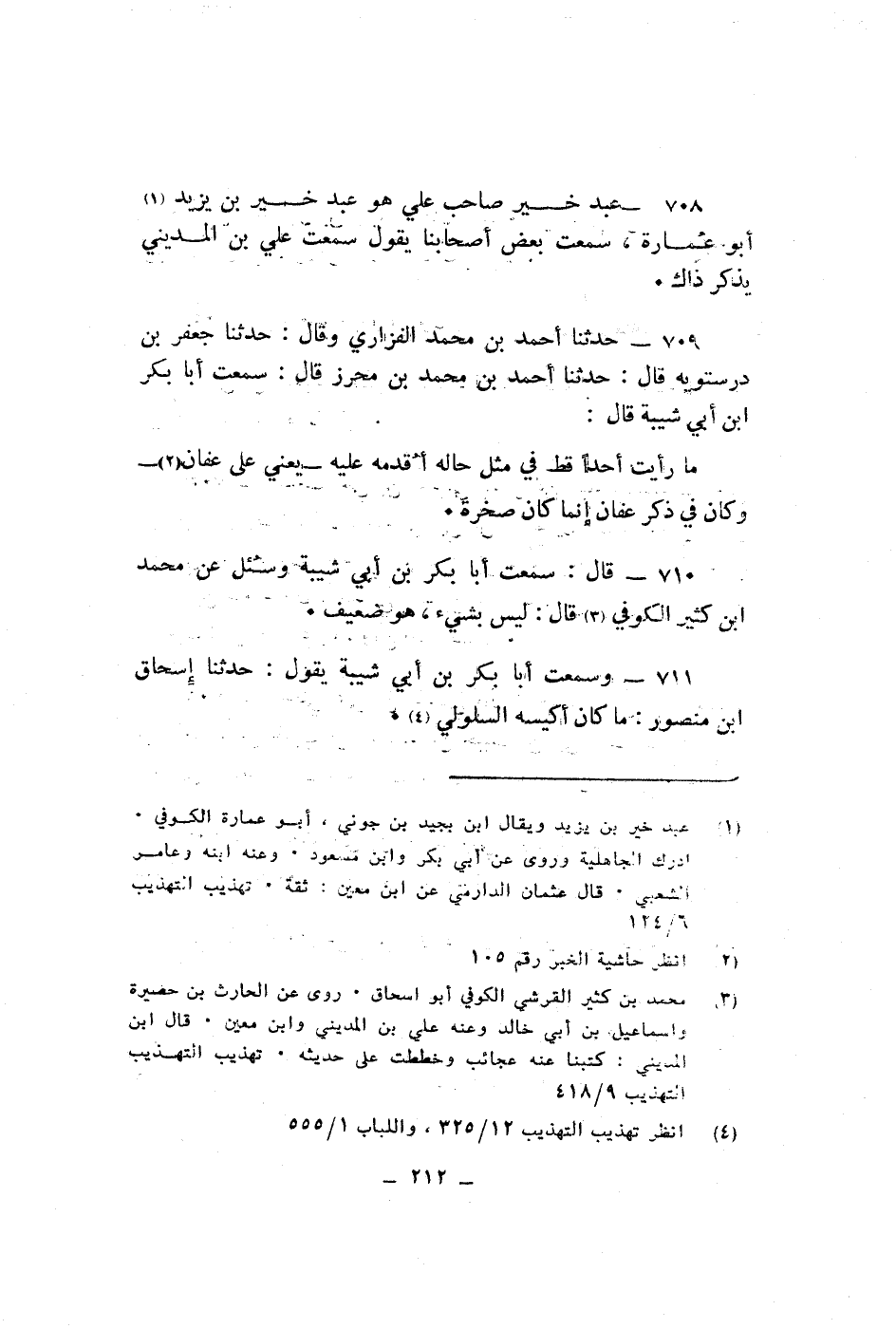 عبد خبير صاحب على هو عبد خبير بن يزيد ابو عمارة سمعت بعض اصحابنا يقول سمعت على بن المدينى يذكر ذاك حدثنا احمد بن محمد الفزارى وقال حدثنا جعفر درستوية قال حدثنا احمد بن محمد بن محرز قال سمعت ابا بكر ابن ابى شيبة قال ما رايتا حدا قط فى مثل حالة أقدمه علية يعنى على عفان وكان فى ذكر عفان انما كان صخرة قال سمعت ابا بكر بن ابى شيبة وسئل عن محمد ابن كثير الكوفى قال ليس بشىء هو ضعيف وسمعت ابا بكر بن ابى شيبة يقول حدثنا اسحاق ابن منصور ما كان اكيسة السلوى