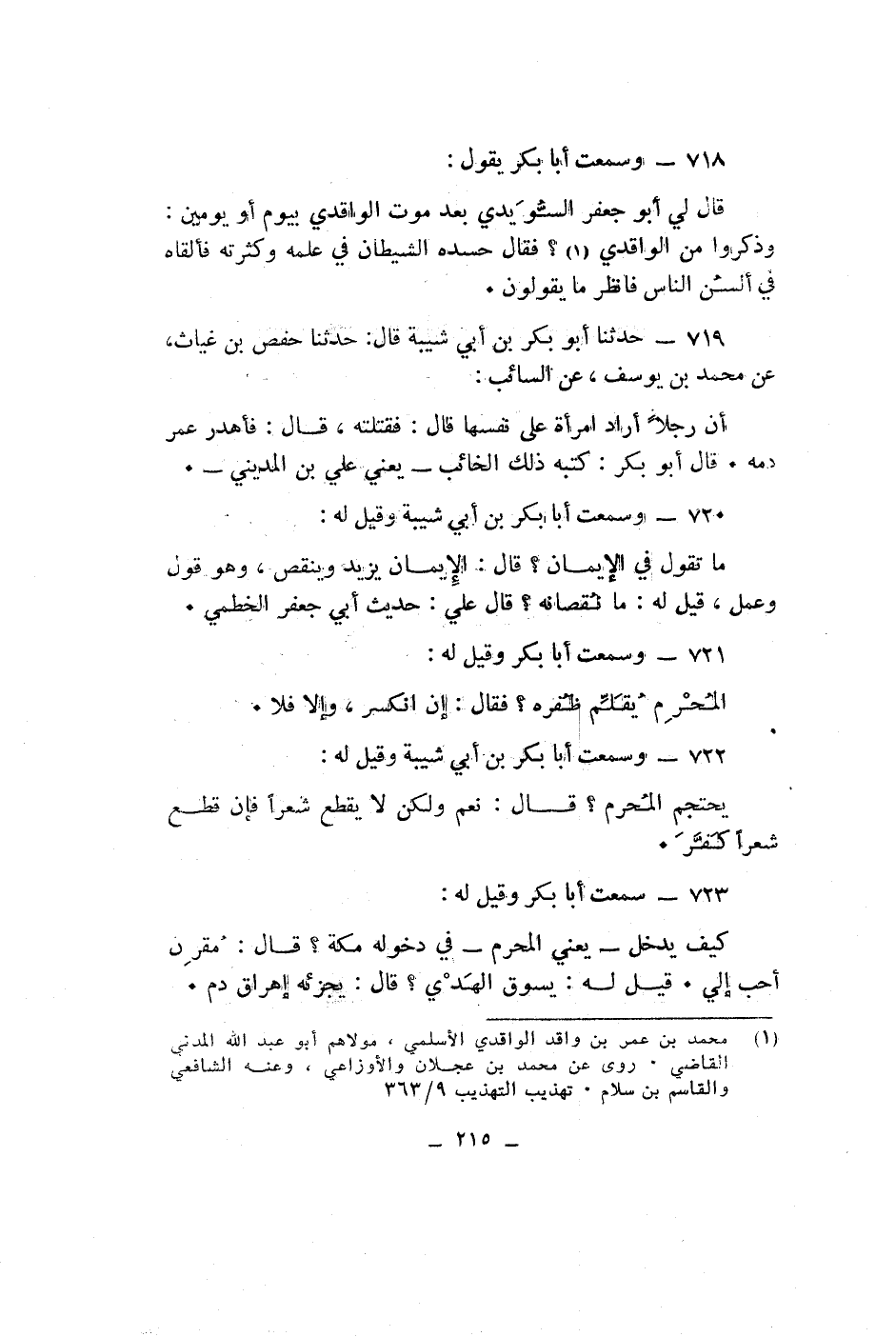 وسمعت ابا بكر يقول قال لى ابو جعفر السويدى بعد موت الواقدى بيوم او يومين وذكروا من الواقدى فقال حسد الشيطان فى علمه وكثرته فألقاه فى ألسن الناس فانظرما يقولون حدثنا ابو بكر بن ابى شبيبة قال حدثنا حفص بن غياث عن محمد بن يوسف عن السائب ان رجلا اراد امرأة على نفسها فال فقتلته قال فأهدر عمر دمه قال ابو بكر كتبه ذلك الخائب يعنى على بن المدينى وسمعت ابا بكر بن ابى شبيبة وقيل له ما تقول فى الايمان قال الايمان يزيد وينقص وهو قول وعمل قيل له ما نقصانه قال على حديث ابى جعفر الخطمى وسمعت ابا بكر وقيل له المحرم يقلم ظفره فقال ان انكسر والا فلا يحتجم المحرم قال نعم ولكن لا يقطع شعرا فإن قطع شعرا كفر سمعت ابا بكر وقيل له كيف يدخل يعنى المحرم فى دخوله مكة قال مقرن احب الى قيل له يسوق الهدى قال يجزئه اهراق دم
