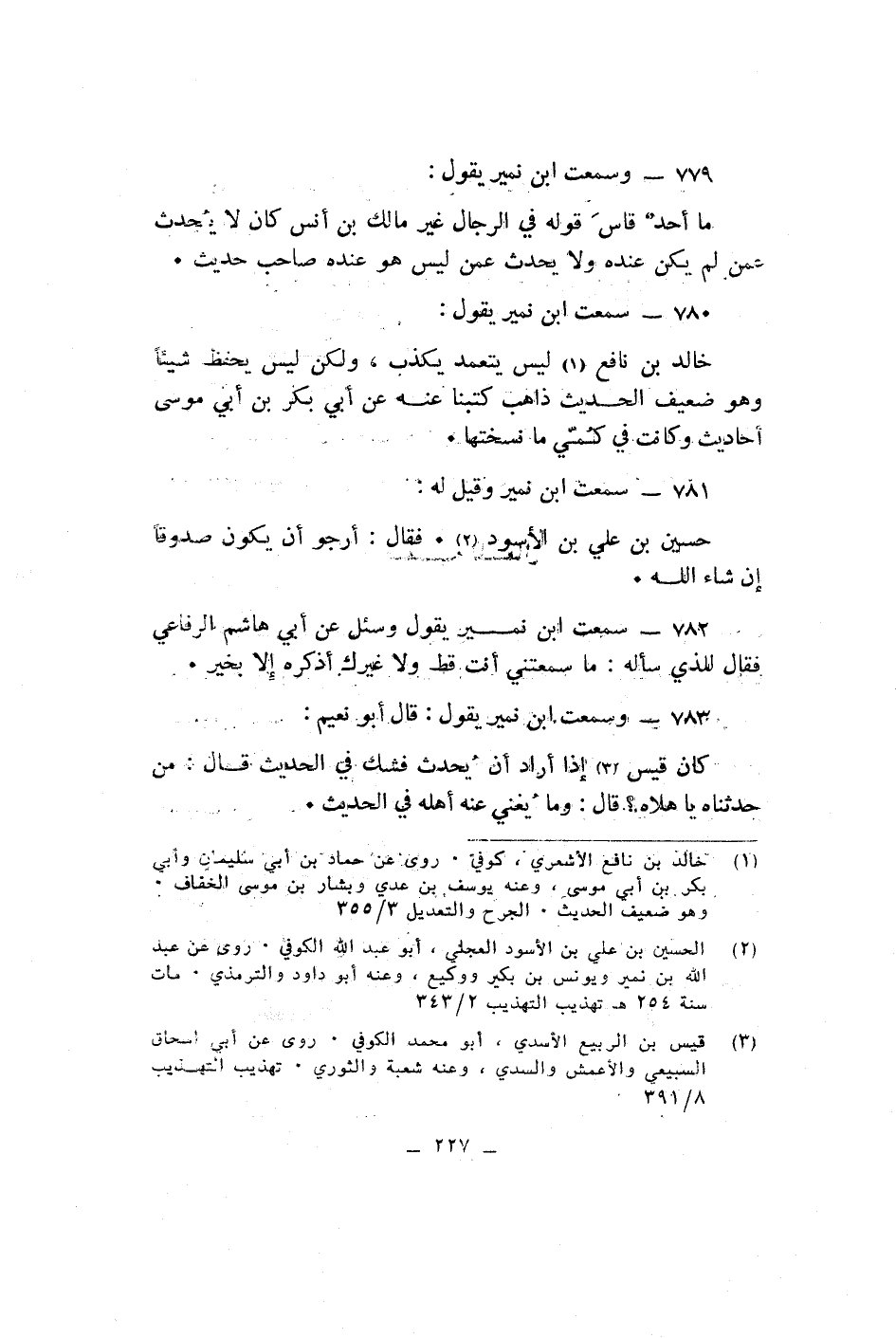 وسمعت ابن نمير يقول ما احد قاس قوله فى الرجال غير مالك بن انس كان لا يحدث عمن لم يكن عنده ولا يحدث عمن ليس هو عنده صاحب حديث سمعت ابن نمير يقول خالد بن نافع ليس يتعمد يكذب ولكن ليس يحفظ شيئا وهو ضعيف الحديث ذاهب كتبنا عنه عن ابى بكر بن ابى موسى احاديث وكانت فى كمى ما نسختها سمعت ابن نمير وقيل له حسين بن على بن الاسود فقال ارجو ان يكون صدوقا ان شاء الله سمعت ابن نمير يقول وسئل عن ابى هاشم الرفاعى فقال للذى سأله ما سمعتنى انت قط ولا غيرك اذكره الا بخير وسمعت ابن نمير يقول قال ابو نعيم كان قيس اذا اراد ان يحدث فشك فى الحديث قال من حدثناه يا هلاه قال وما يغنى عنه اهله فى الحديث
