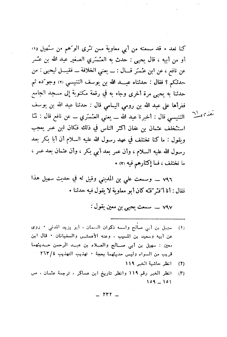 كنا نعد قد سمعته من ابى معاوية ممن ترى الوهم من سهيل او من ابيه قال يحيى حدث به العمرى الصغير عبد الله بن عمير عن نافع عن ابن عمر قال يعنى الخلافة فقيل ليحيى من حدثكم فقال حدثنا عبد الله بن يوسف التنيسى وجوده ثم حدثنا به يحيى مرة اخرى وجاء به فى رقعة مكتوبة الى المسجد الجامع فقرأها على عبد الله بن رومى اليمامى قال حدثنا عبد الله بن يوسف التنيسى قال اخبرنا عبد الله يعنى العمرى عن نافع قال لما استخلف عثمان بن عفان اكثر الناس فى ذلك فكان ابن عمر يعجب ويقول ما كنا نختلف فى عهد رسول الله عليه السلام ان ابا بكربعد رسول الله عليه السلام ان عمر بعد ابى بكر وان عثمان بعد عمر ما تختلف فما اكثارهم فيه وسمعت على بن المدينى وقيل له فى حديث سهيل هذا فقال انا افرقه كان ابو معاوية لا يقول فيه حدثنا سمعت يحيى بن معين يقول