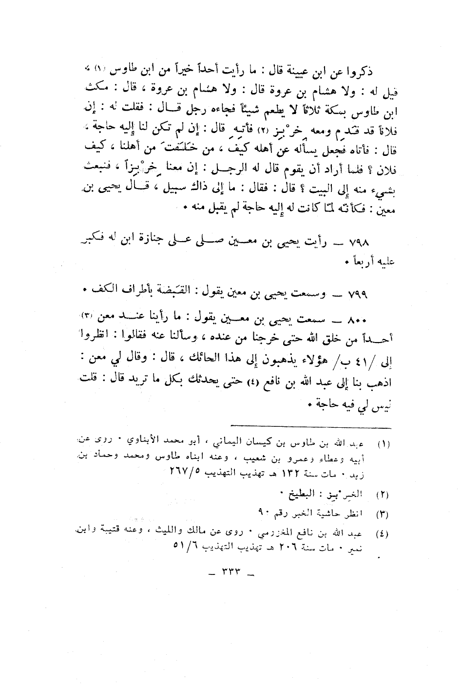 ذكروا عن ابن عيينة قال ما رايت احدا خيرا من ابن طاوس قيل له ولا هشام بن عروة قال ولا هشام بن عروة قال مكث ابن طاوس بمكة ثلاثا لا يطعم شيئا فجاءه رجل قال فقلت له ان فلانا قد قدم ومعه خربز فأته قال ان لم تكن لنا اليه حاجة قال فأتاه فجعل يسأله عن أهله كيف من خلفت من اهلنا كيف فلان فلما اراد ان يقوم قال له الرجل ان معنا خربزا فنبعث بشيء منه الى البيت قال فقال ما الى ذاك سبيل فال يحيى بن معين فكأنه لما كانت له اليه حاجة لم يقبل منه رأيت يحيى بن معين صلى على جنازة ابن له فكبر عليه اربعا وسمعت يحيى بن معين يقول القبضة بأطراف الكف سمعت يحيى بن معين يقول ما راينا عند معنا حدا من خلق الله حتى خرجنا من عنده وسالنا عنه فقالوا انظروا الى هؤلاء يذهبون الى هذا الحائك قال وقال لى معن اذهب بنا الى عبد الله بن نافع حتى يحدثك بكل ما تريد قال قلت ليس لى فيه حاجة