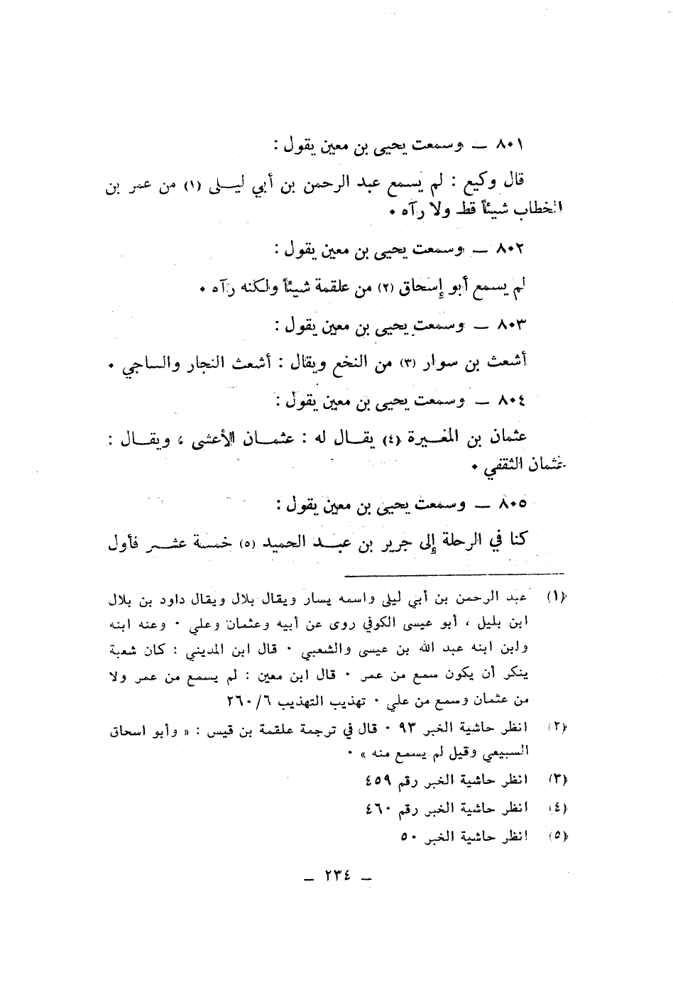 وسمعت يحيى بن معين يقول قال وكيع لم يسمع عبد الرحمن بن ابى ليلى من عمر بن الخطاب شيئا قط ولا رآه وسمعت يحيى بن معين يقول لم يسمع ابو اسحاق من علقمة شيئا ولكنه رآه وسمعت يحيى بن معين يقول أشعت بن سوار من النخع ويقال أشعت النجار والساجى وسمعت يحيى بن معين يقول عثمان بن المغيرة يقال له عثمان الاعشى ويقال عثمان الثقفى وسمعت يحيى بن معين يقول كنا فى الرحلة الى جرير بن عبد الحميد خمسة عشر فأول