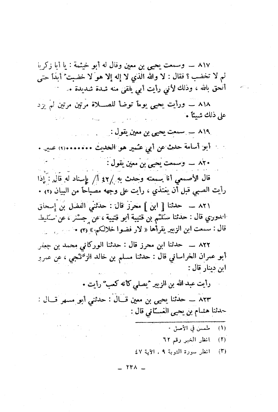 وسمعت يحيى بن معين وقال له ابو خيثمة يا ابا زكريا لم لا تخضب فقال لا والله الذى لا اله الا هو لا خضيب ابدا حتى الحق بالله وذلك لأنى رأيت ابى يلقى منه شدة شديدة ورأيت يحيى يوما توضأللصلاة مرتين لم يزد على ذلك شيئا سمعت يحيى بن معين يقول ابو اسامة حدث عن ابى عمير هو الحديث عمير وسمعت يحيى بن معين يقول قال الأعصمى انا سمعته وجدت به بإسناد له قال اذا رأيت الصبى قبل ان يغذى رأيت على وجهه مصباحا من البيان حدثنا ابن محرز قال حدثنى الفضل بن اسحاق الدورى قال حدثنا سلم بن قتيبة ابو قتيبة عن جسر عن سليط قال سمعت ابن الزبير يقرأها لا رفضوا خلالكم حدثنا ابن محرز قال حدثنا الوركانى محمد بن جعفر ابو عمران الخراسانى قال حدثنا مسلم بن خالد الزنجى عن عمرو ابن دينار قال رأيت عبد الله بن الزبير يصلى كأنه كعب رأيت حدثنا يحيى بن معين قال حدثنى ابو مسهر قال حدثنا هشام بن يحيى الغسانى قال