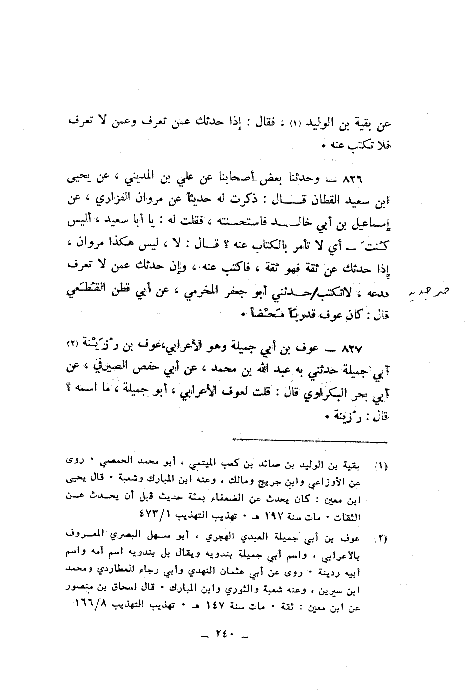 عن بقية بن الوليد فقال اذا حدثك عمن تعرف وعمن لا تعرف فلا تكتب عنه وحدثنا بعض اصحابنا عن على بن المدينى عن يحيى ابن سعيد القطان قال ذكرت له حديثا عن مروان الفزارى عن اسماعيل بن ابى خالد فاستحسنته فقلت له يا ايا سعيد اليس كنت اى لا تأمر بالكتاب عنه قال لا ليس هكذا مروان اذا حدثك عن ثقة فهو ثقة فاكتب عنه وان حدثك عمن لا تعرف فدعه لا تكتب حدثنى ابو جعفر المخرمى عن ابى قطن القطعى قال كان عوف قدريا محضا عوف بن ابى جميلة وهو الاعرابى عوف بن رزينة ابى جميلة حدثنى عبد الله بن محمدعن ابى حفص الصيرفى عن ابى بحر البكراوى قال قلت لعوف الاعرابى ابو جميلة ما اسمعه قال رزينة