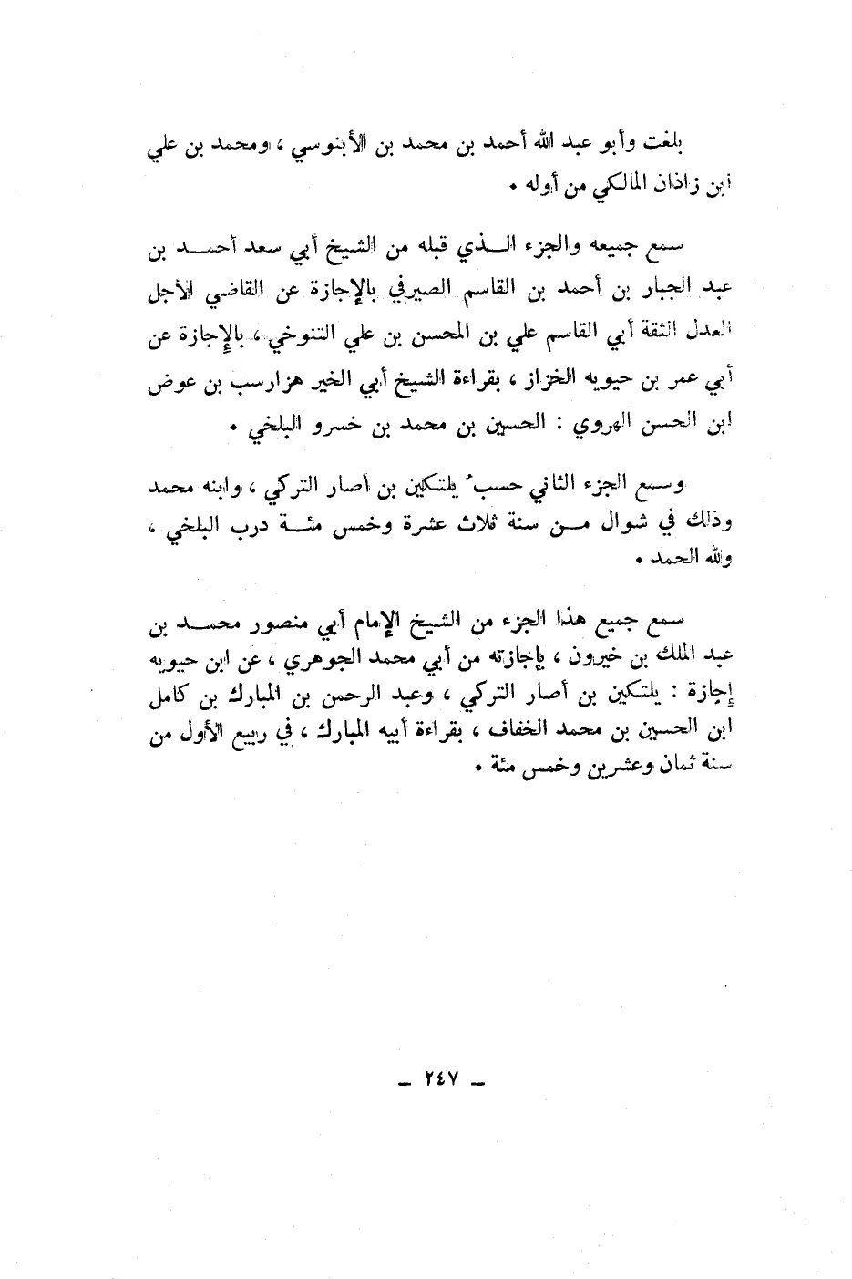 بلغت ابو عبد الله احمد بن محمد بن الأنبوسي ومحمد بن على ابن زادان المالكى من اوله سمع جميعه والجزء الذى قبله من الشيخ ابى سعد احمد بن عبد الجبار بن احمد بن القاسم الصيرفى بالإجازة عن القاضى لأجل العدل الثقة ابى القاسم على بن المحسن بن على التنوخى بالإجازة عن ابى عمر بن حيوية الخزاز بقراءة الشيخ ابى الخير هزارسب بن عوض ابن الحسن الهروى الحسين بن محمد بن خسرو البلخى وسمع الجزء الثانى حسب يلتكين بن اصار التركى وابنه محمد وذلك فى شوال من سنة ثلاث عشرة وخمس مئة درب البلخى ولله الحمد سمع جميع هذا الجزء من الشيخ الإمام ابى منصور محمد بن عبد الملك بن خيرون بإجازته من ابى محمد الجوهرى عن ابن حيوية اجازة يلتكن بن اصار التركى وعبد الرحمن بن المبارك بن كامل ابن الحسين بن محمد الخفاف بقراءة ابيه المبارك فى ربيع الاول من سنة ثمان وعشرين وخمس مئة