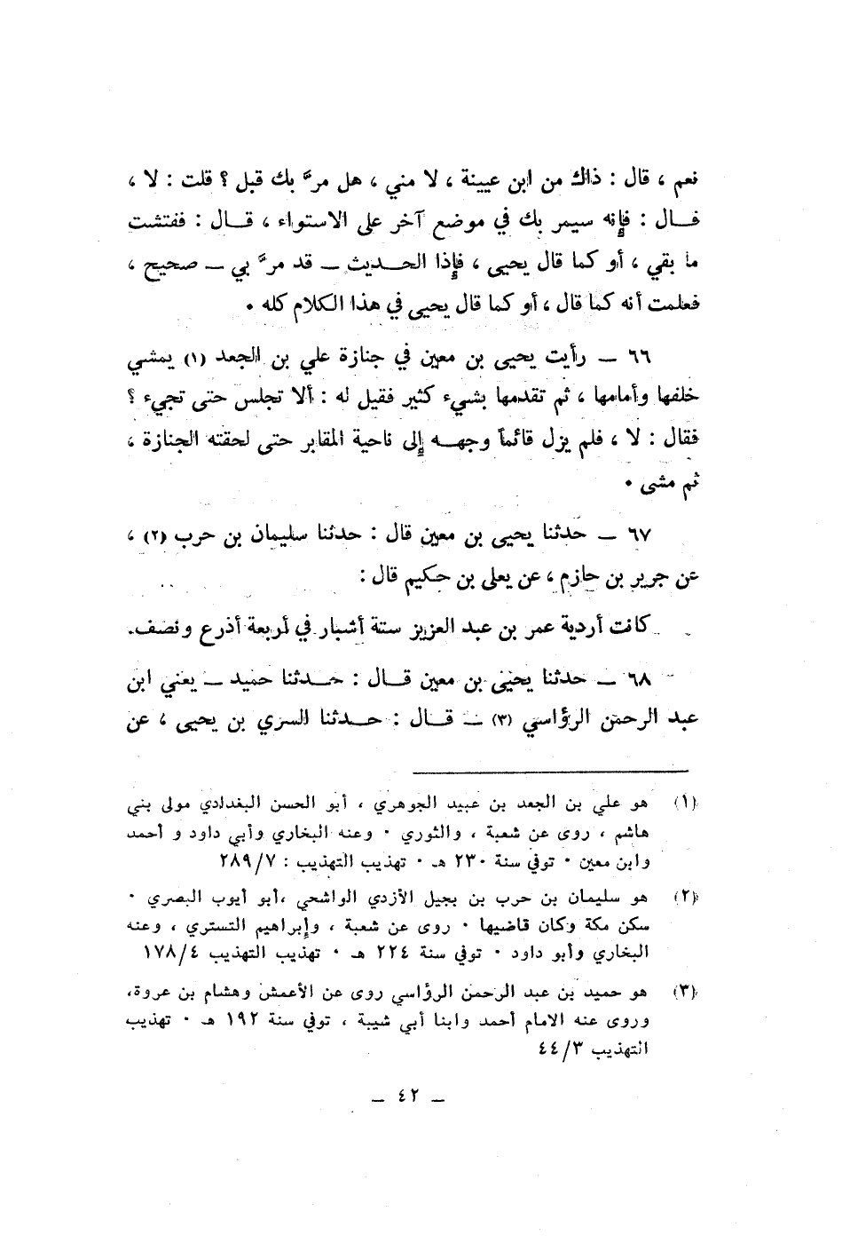نعم قال ذاك من ابن عيينة لا منى هل مر بك قبل قلت لا قال فانه سيمر بك فى وضع آخر على الاستواء قال ففتشت ما بقي أو كما قال يحيى فاذا الحديث قد مر بي صحيح فعلمت انه كما قال او كما قال يحيى في هذا الكلام كله رأيت يحيى بن معين في جنازة علي بن الجعد يمشي خلفها وأمامها ثم تقدمها بشيء كثير ِفقيل له ألا تجلس حتى تجيء فقال لا فلم يزل قائما وجهه الى ناحية المقابر حتى لحقته الجنازة ثم مشى حدثنا يحيى بن معين قال حدثنا سليمان بن حرب عن جرير بن حازم عن يعلى بن حكيم قال كانت أردية عمر بن عبد العزيز ستة أشبار في أربعة اذرع ونصف حدثنا يحيى بن معين قال حدثنا حميد يعني ابن عبد الرحمن الرؤاسي قال حدثنا السري بن يحيى عن