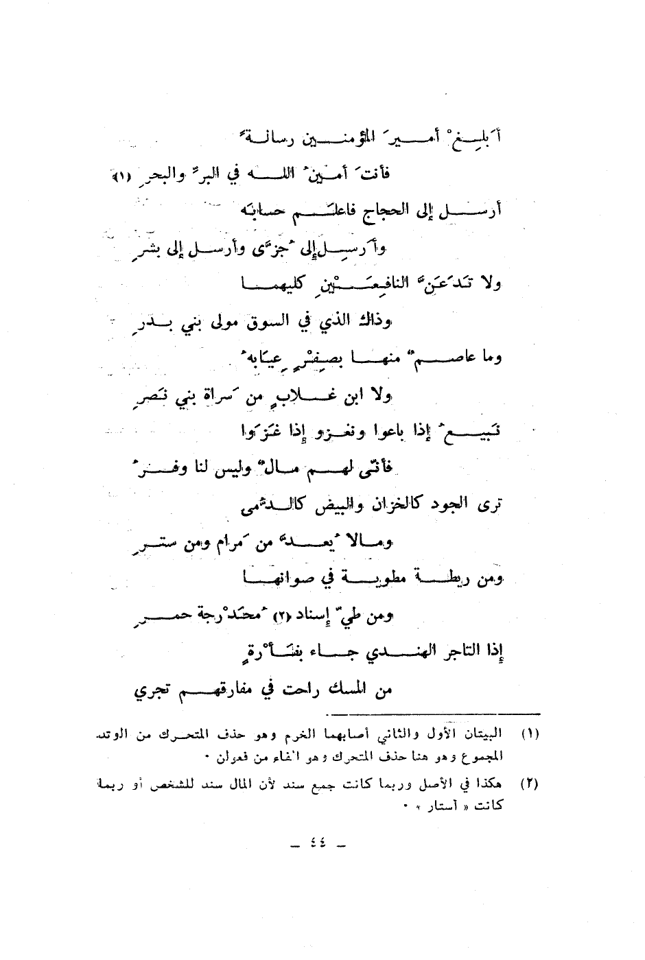 أبلغ امير المؤمنين رسالة فأت أمين الله البر والبحر أرسل الى الحجاج فأعلم حسابه وأرسل الى جزى وأرسل الى بشر ولا تدعن النافعين كليهما وذاك الذى فى السوق مولى بنى بدر وما عاصم منها بصفر عيابه ولا ابن غلاب من سراة بنى نصر نبيع اذا باعوا ونغزو اذا غزوا فأنى لهم مال وليس لنا فر ترى الجود كاخزان والبيض كالدمى ومالا يعد من مرام ومن ستر ومن ريطة مطوية فى صوانها ومن طوى اسناد محدرجة حمر اذا التاجر الهندى جاء بفأرة من المسك راحت فى مفارقهم تجرى