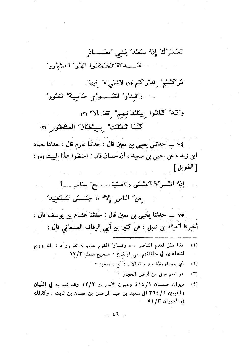 لعمرك ان سعد بنى معاذ غداة تحملوا لهو الصبور تركتهم قدركم لاشيء فيها وقدر القوم حامية تفور وقد كانوا ببلدتهم ثقالا كما ثقلت بميطان الصخور حدثنى يحيى بن معين قال حدثنا حماد ابن زيد عن يحيى بن سعد ان حسان قال احفظوا هذا البيت الطويل ان امرءا امسي واصبح سالما من الناس الا ماجنى لسعيد حدثنا يحيى بن معين قال حدثنا هشام بن يوسف قال اخبرنا امية بن شبل عن كثير بن ابى الرفاف الصناعى قال