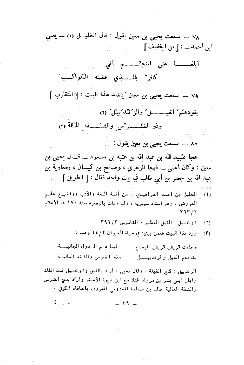 سمعت يحيى بن معين يقول قال الخليل يعنى ابن احمد من الخفيف أبلغنا عنى المنجم انى كافر بالذى قضته الكواكب سمعت يحيى بن معين ينشد هذا البيت المتقارب يقودهم الفيل والزند بيل وذو الضرس والشفة المائلة سمعت يحيى بن معين يقول هجا عبيد الله بن عتبة بن مسعود قال يحيى بن معين وكان أعمى فهجا الزهرى وصالح بن كيسان ومعاوية بن عبد الله بن حعفر بن ابى طالب فى بيت واحد فقال الطويل