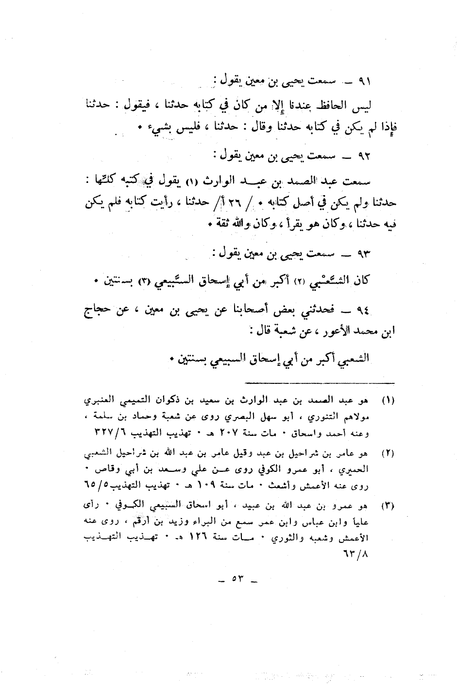 سمعت يحيى بن معين يقول ليس الحافظ عندنا الا من كان فى كتابنا حديثا فيقول حدثنا فاذا لم يكن فى كتابه حدثنا وقال حدثنا فليس بشىء سمعت يحيى بن معين يقول سمعت عبد الصمد بن عبد الوارث يقول فى كتبه كلها حدثنا ولم يكن فى اصل كتابه حدثنا رايت كتابه فلم يكن فيه حدثنا وكان هو يقرا وكان والله ثقة سمعت يحيى بن معين يقول كان الشعبى اكبر من ابى اسحاق السبيعى بسنتين فحدثنى بعض اصحابنا عن يحيى بن معين عن حجاج ابن محمد الاعور عن شعبة قال الشعبى اكبر من ابى اسحاق السبيعى بسنتين
