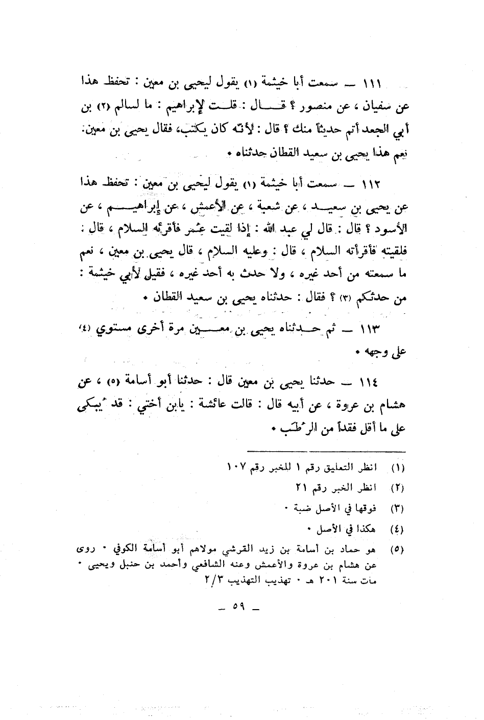 سمعت أبا خيثمة يقول ليحيى بن معين تحفظ هذا عن سفيان عن منصور قال قلت لابراهيم ما لسالم بن أبي الجعد اتم حديثا منك قال لأنه كان يكتب فقال يحيى بن معين نعم هذا يحيى بن سعيد القطان حدثناه سمعت أبي خيثمة يقول ليحيى بن معين تحفظ هذا عن يحيى بن سعيد عن شعبة عن الأعمش عن ابراهيم عن الأسود قال قال لي عبد الله اذا لقيت عمر فأقرئه السلام قال فلقيته فأقرأته السلام قال وعليه السلام قال يحيى بن معين نعم ما سمعته من أحد غيره ولا حدث به أحد غيره فقيل لأبي خيثمة من حدثكم فقال حدثناه يحيى بن سعيد القطان ثم حدثناه يحيى بن معين مرة أخرى مستوى على وجهه حدثنا يحيى بن معين قال حدثنا أبو أسامة عن هشام بن عروة عن أبيه قال قالت عائشة يا بن اختي قد يبكي على ما أقل فقدا من الرطب