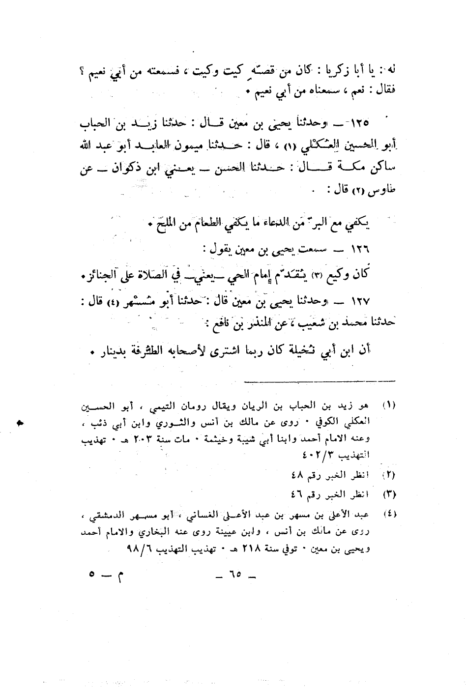 له يا ابا زكريا كان من قصة كيت وكيت فسمعته من ابى نعيم فقال نعم سمعناه من ابى نعيم وحدثنا يحيى بن نعيم قال حدثنا زيد بن الحباب ابو الحسين العكلى قال حدثنا ميمون العابد ابو عبد الله ساكن مكة قال حدثنا الحسن يعنى ابن ذكوان عن طاوس قال يكفى مع البر من الدعاء ما يكفى الطعام من الملح سمعت يحيى بن معين يقول كان وكيع يقدم امام الحى يعنى فى الصلاة على الجنائز وحدثنا يحيى بن معين قال حدثنا ابو مسهر قال حدثنا محمد بن شعيب عن المنذر بن نافع ان ابن ابى نخلية كان ربما اشترى لأصحابه الطرفة بدينار