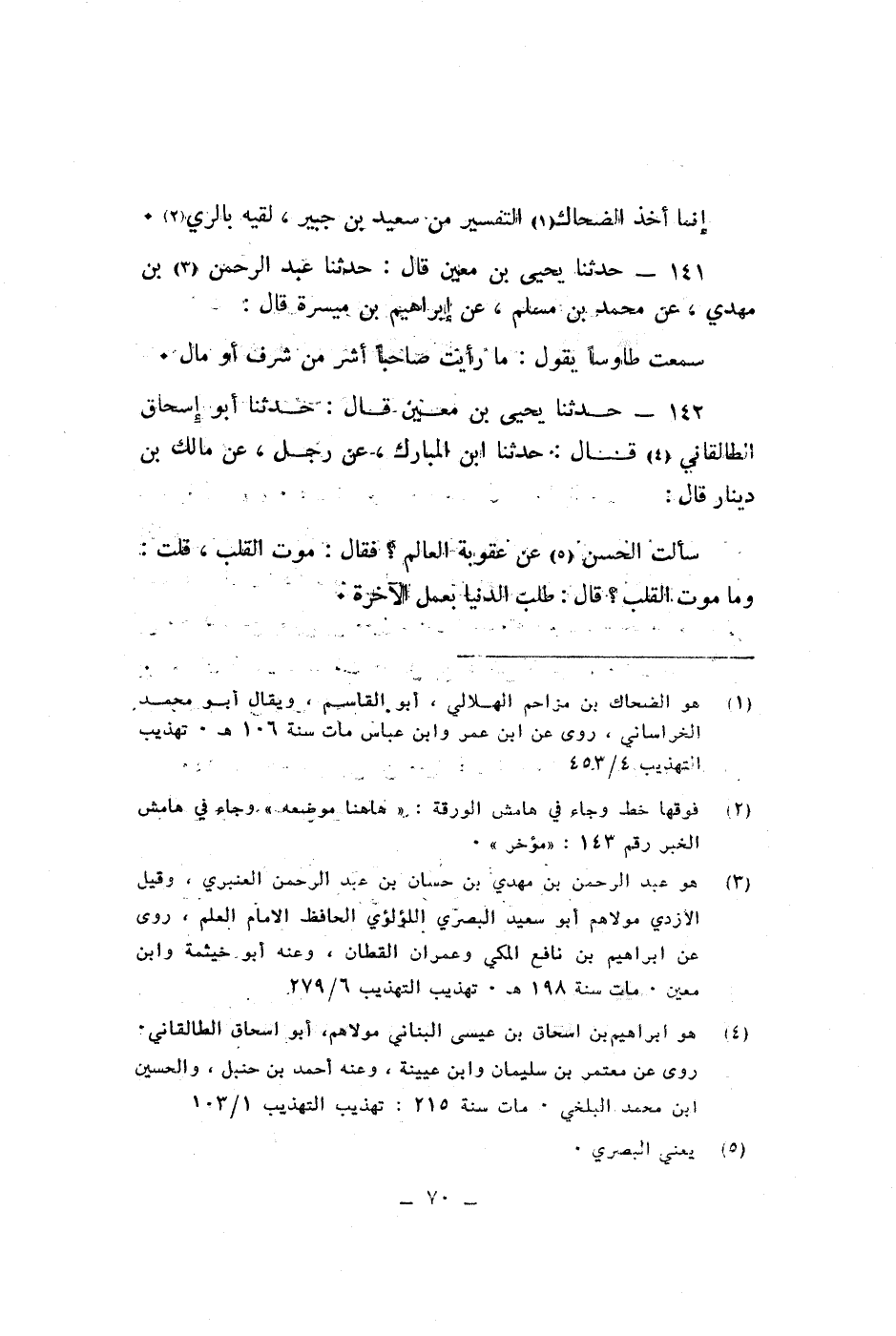 انما أخذ الضحاك التفسير من سعيد بن جبير لقيه بالرى حدثنا يحيى بن معين قال حدثنا عبد الرحمن بن مهدى عن محمد بن مسلم عن ابراهيم بن ميسرة قال سمعت طاوسا يقول ما رأيت صاحبا أشر من شرف أو مال حدثنا يحيى بن معين قال حدثنا ابو اسحاق الطالقانى قال حدثنا ابن المبارك عن رجل عن مالك بن دينار قال سألت الحسن عن عقوبة العالم فقال موت القلب قلت وما موت القلب قال طلب الدنيا بعمل الآخرة