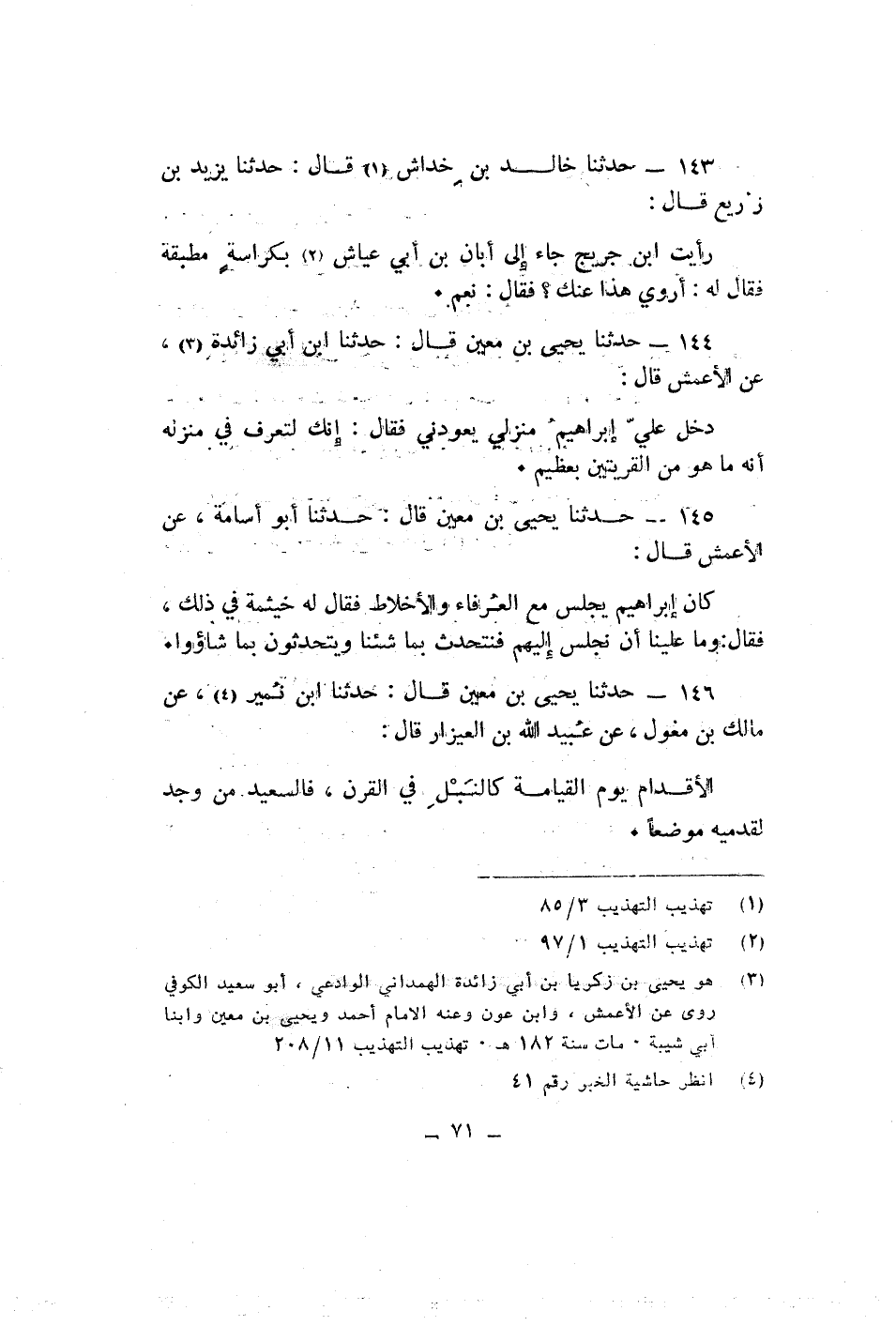 حدثنا خالد بن خداش قال حدثنا يزيد بن زريع قال رأيت ابن جريح جاء الى ابان بن ابى عياش بكراسة مطبقة فقال له اروى هذا عنك فقال نعم حدثنا يحيى بن معين قال حدثنا ابن ابى زائدة عن الأعمش قال دخل على ابراهيم منزلى يعودنى فقال انك لتعرف فى منزله انه ما هو من القريتين بعظيم حدثنا يحيى بن معين قال حدثنا ابو اسامة عن الأعمش قال كان ابراهيم يجلس مع العرفاء والأخلاط فقال له خيثمة فى ذلك فقال وما علينا ان نجلس اليهم فنتحدث بما شئنا ويتحدثون بما شاؤوا مالك بن مغول عن عبيد الله بن العيزار قال الأقدام يوم القيامة كانبل فى القرن فالسعيد من وجد لقدميه موضعا