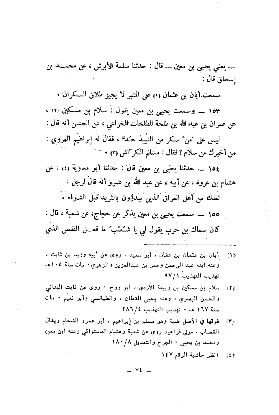 يعنى يحيى بن معين قال حدثنا سلمة الابرش عن محمد بن اسحاق قال سمعت ابان بن عثمان على المنبر لا يجيز طلاق السكران وسمعت يحيى بن معين يقول سلام بن مسكين عن عمران بن عبد الله بن طلحة الطلحات الخزاعى عن الحسن أنه قال ليس على من سكر من النبيذ حد فقال له ابراهيم الهروى من أخبرك عن سلام فقال مسلم الكراش حدثنا يحيى بن معين قال حدثنا ابو معاوية عن هشام بن عروة عن ابيه عن عبد الله بن عمرو انه قال لرجل لعلك من أهل العراق الذين يبدؤن بالثريد قبل الشواء سمعت يحيى بن معين يذكر عن حجاج عن شعبة قال كان سماك بن حرب يقول لى ياشعت ما فعل القفص الذى