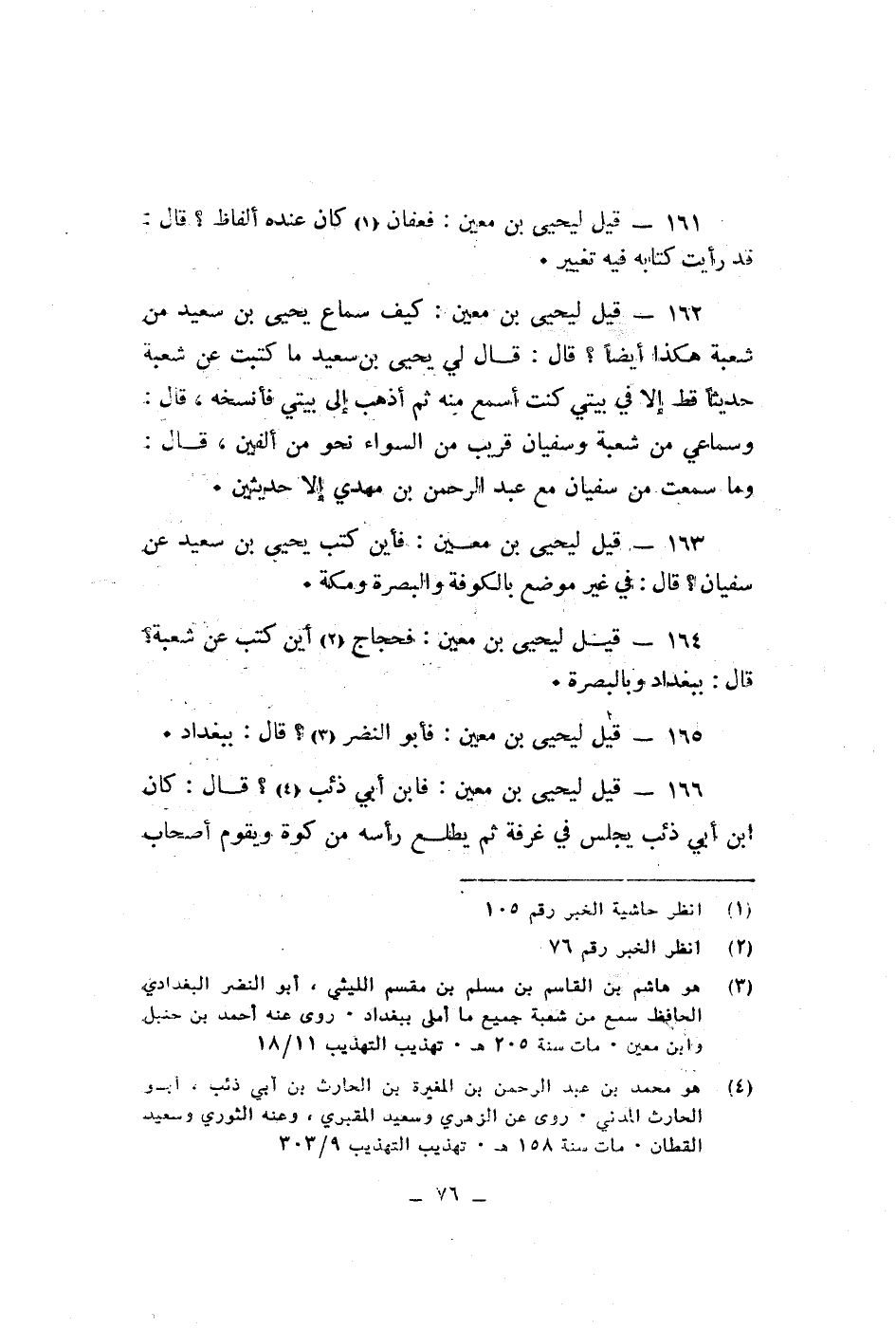 قيل ليحيى بن معين فعفان كان عنده ألفاظ قال قد رأيت كتابه فيه تغير قيل ليحيى بن معين كيف سماع يحيى بن سعد من شعبة هكذا ايضا قال لى يحيى بن سعد ما كتبت عن شعبة حديثا قط الا فى بيتى كنت اسمع منه ثم أذهب الى بيتى فانسخه قال وسماعى من شعبة وسفيان قريب من السواء نحو من الفين قال وما سمعت من سفيان مع عبد الرحمن بن مهدى الا حديثين قيل ليحيى بن معين فاين كتب يحيى بن سعيد عن سفيان قال فى غير موضع بالكوفة والبصرة ومكة قيل ليحيى بن معين فحجاج اين كتب عن شعبة قال ببغداد بالبصرة قيل ليحيى بن معين فابو النضر قال ببغداد قيل ليحيى بن معين فابن ابى ذئب قال كان ابى ابن ذئب يجلس فى غرفة ثم يطلع رأسه من كوة ويقوم اصحاب