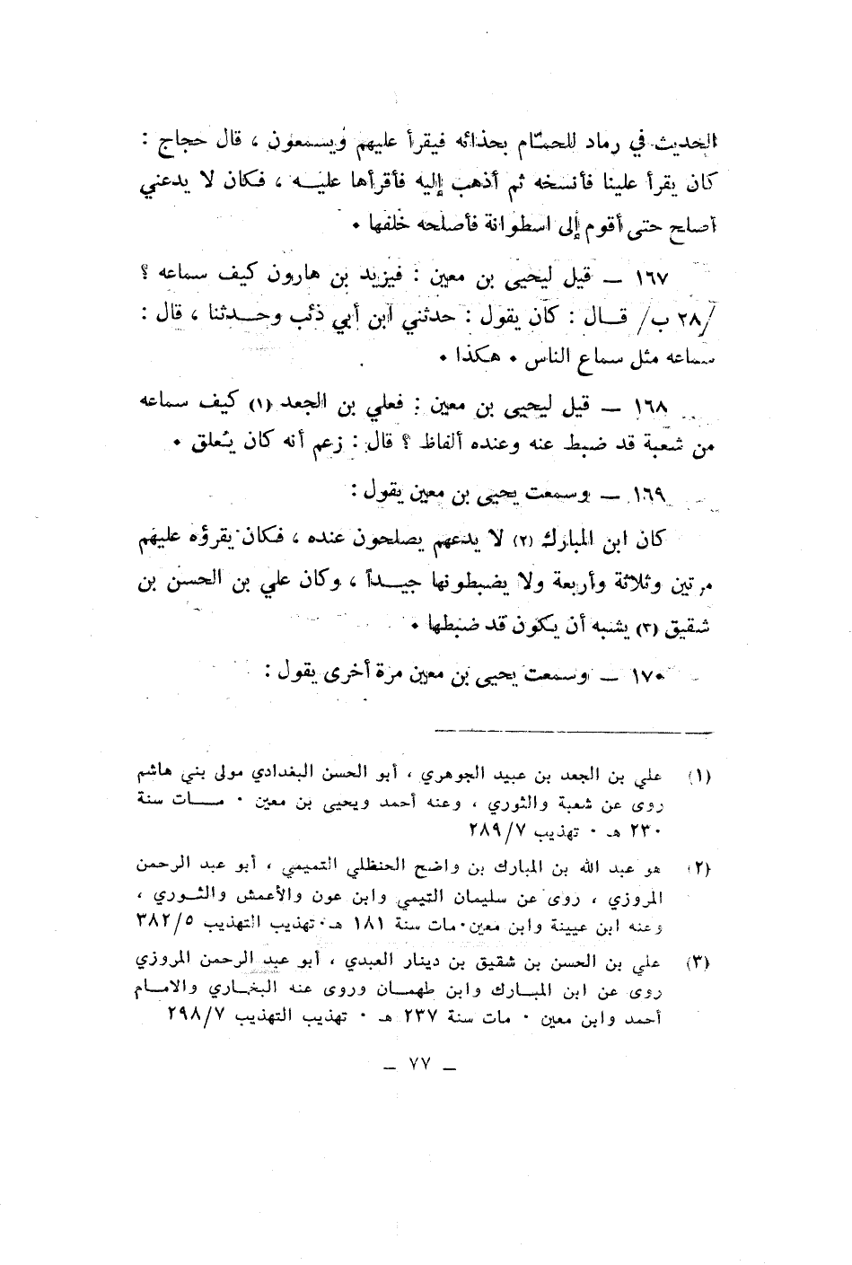 الحديث في رماد للحمام بحذائه فيقرأ عليهم ويسمعون قال حجاج كان يقرأها عليه فكان لايدعني أصلح حتى أقوم الى اسطوانة فأصلحه خلفها قيل ليحيى بن معين فيزيد بن هارون كيف سماعه 28ب قال كان يقول حدثني إبن أبي ذئب وحدثنا قال سماعه مثل سماع الناس هكذا قيل ليحيى بن معين فعلي بن الجعد كيف سمعه من شعبة قد ضبط عنه وعنده ألفاظ قال زعم أنه كان يعلق وسمعت يحيى بن معين يقول كان ابن مبارك لايدعهم يصلحون عنده فكان يقرؤه عليهم مرتين وثلاثة وأربعة ولايضبطونها جيدا وكان علي بن الحسن بن شقيق يشبه أن يكون قد ضبطها وسمعت يحيى بن معين مرة اخرى يقول