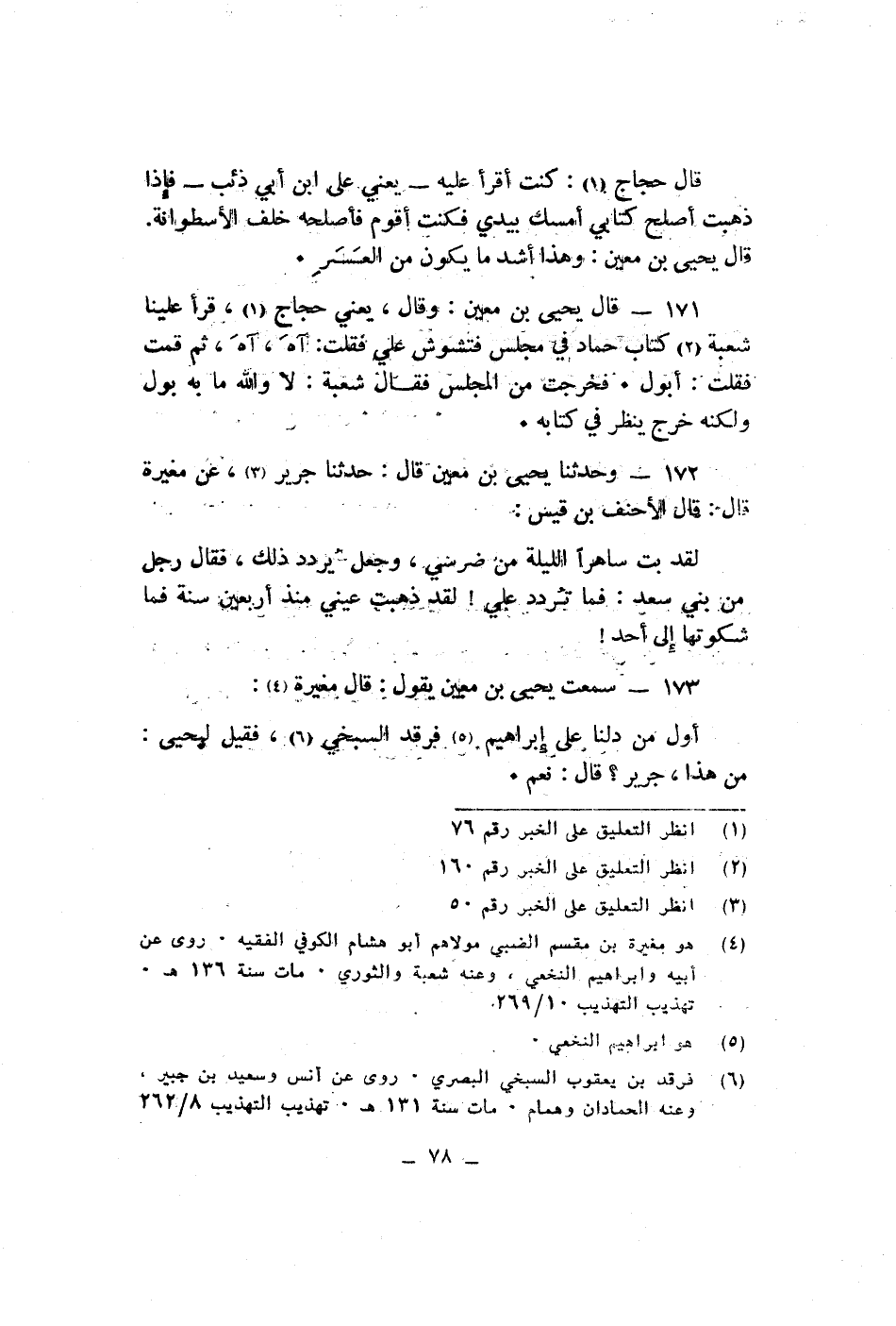 قال حجاج كنت أقرأعليه يعنى على ابن ابى ذئب فإذا ذهبت أصلح كتابى أمسك بيدى فكنت أقوم فأصلحه خلف الأسطوانه قال يحيى بن معين وهذا أشد ما يكون من العسر قال يحيى بن معين وقال يعنى حجاج قرأعلينا شعبة كتاب حماد فى مجلس فتشوش على فقلت آه آه ثم قمت قلت أبول فخرجت من المجلس فقال شعبة لا والله ما به بول ولكنه خرج ينظر فى كتابه وحدثنا يحيى بن معين قال حدثنا جرير عن مغيرة قال قال الأخف بن قيس لقد بت ساهرا الليلة من ضرسي وجعل يردد على لقد ذهبت عينى منذ اربعين سنة فما شكوتها الى أحد سمعت يحيى بن معين قال مغيرة أول من دلنا على ابراهيم فرقد السبخى فقيل ليحيى من هذا جرير قال نعم
