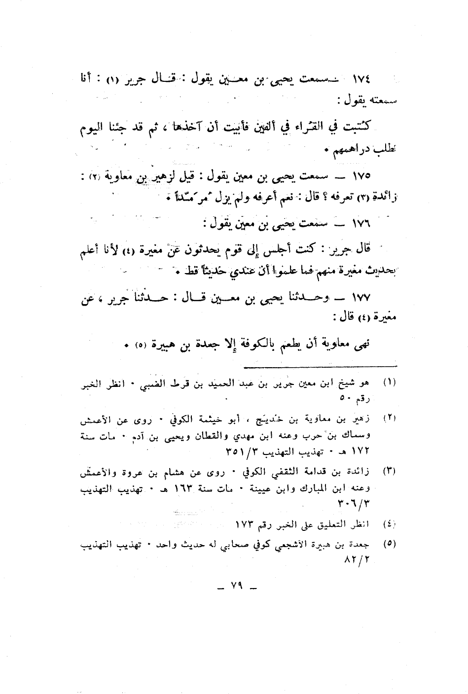سمعت يحيى بن معين يقول قال جرير انا سمعته يقول كتبت فى القراء فى الفين فابيت ان آخذها ثم قد جئنا اليوم لطلب دراهمهم سمعت يحيى بن معين يقول قيل لزهير بن معاوية زائدة تعرفه قال نعم أعرفه ولم يزل مرمدا سمعت يحيى بن معين يقول قال جرير كنت أجلس الى قوم يحدثون عن مغيرة لأنا أعلم بحديث مغيرة منهم فما علموا انع ندى حديثا قط وحدثنا يحيى بن معين قال حدثنا جرير عن مغيرة قال نهى معاوية ان يطعم بالكوفة الا جعدة بن هبيرة