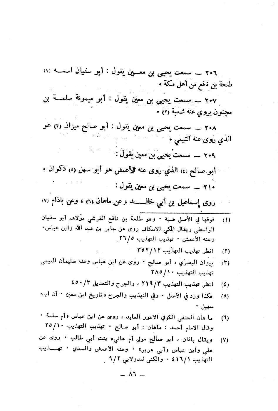 سمعت يحيى بن معين يقول ابوسفيان اسمه طلحة بن نافع من اهل مكة سمعت يحيى بن معين يقول ابو ميمونة سلمة بن مجنون يروى عنه شعبة سمعت يحيى بن معين يقول ابو صالح ميزان هو الذى روى عنه التيمى سمعت يحيى بن معين يقول ابو صالح الذى روى عنه الأعمش هو ابو سهل ذكوان سمعت يحيى بن معين يقول روى اسماعيل بن ابى خالد عن ماهان وعن باذام