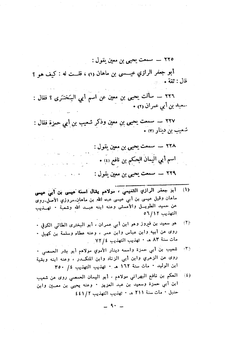 سمعت يحيى بن معين يقول ابو جعفر الرازى عيسى بن ماهان قلت له كيف هو قال ثقة سألت يحيى بن معين عن اسم ابى البخترى فقال سعيد بن ابى عمران سمعت يحيى بن معين وذكر شعيب بن ابى حمزة فقال سعيب بن دينار سمعت يحيى بن معين يقول اسم ابى اليمان الحكم بن نافع سمعت يحيى بن معين يقول