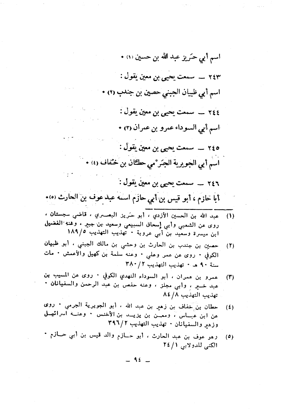 اسم ابى حريز عبد الله بن حسين سمعت يحيى بن معين يقول اسم ابى ظبيان الجبنى حصين بن جندب سمعت يحيى بن معين يقول اسم ابى السوداء عمرو بن عمران سمعت يحيى بن معين يقول اسم ابى الجويرية الجرمى حطان بن خفاف سمعت يحيى بن معين يقول ابات حازم ابو قيس بن ابى حازم اسمه عبد عوف بن الحارث